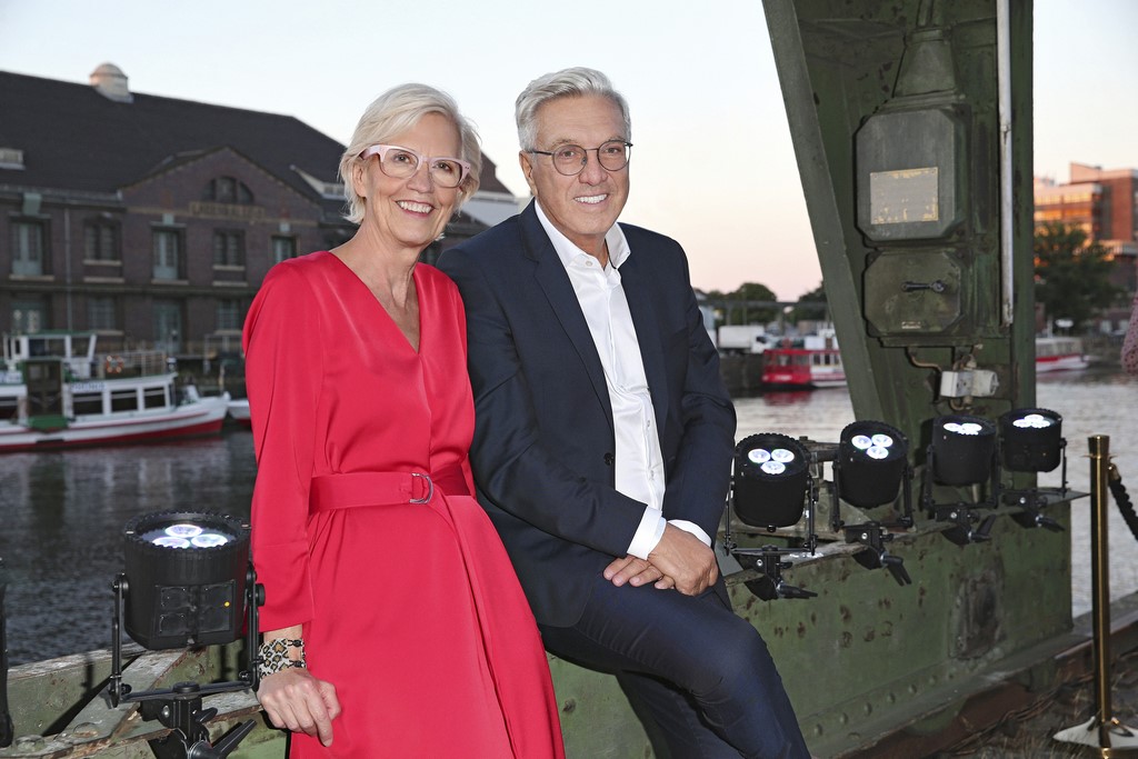 Große Beitragsfoto: Gründer und CEO Halmut Schlotterer bedankt sich nach der Marc Cain Fashion Show Spring/Summer 2019 im WEEC, Westhafen, bei Chefdesignerin Karin Veit (Foto Gisela Schober/Getty Images for Marc Cain)