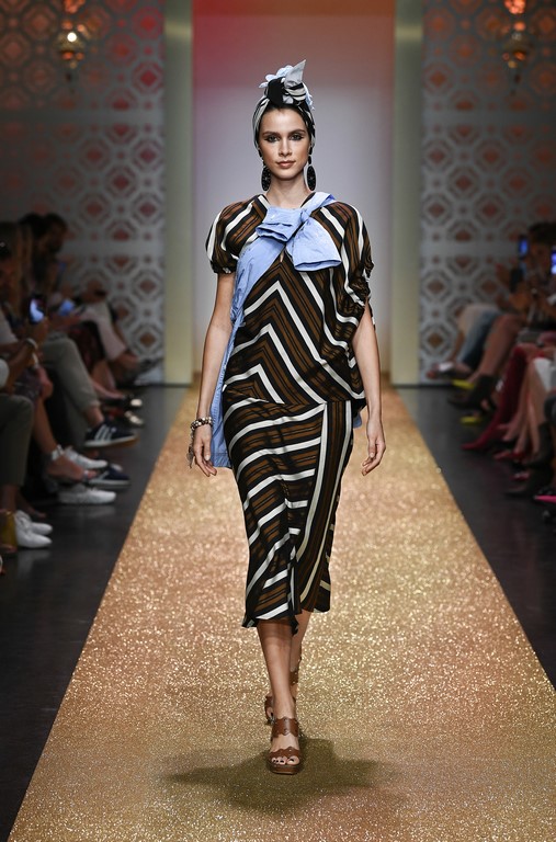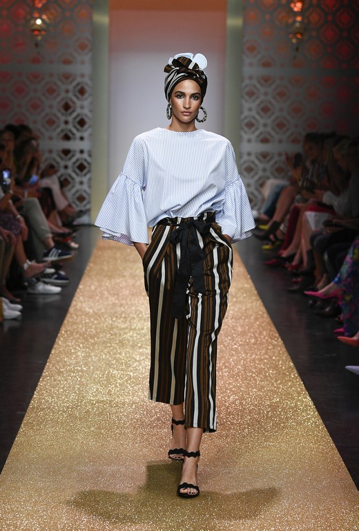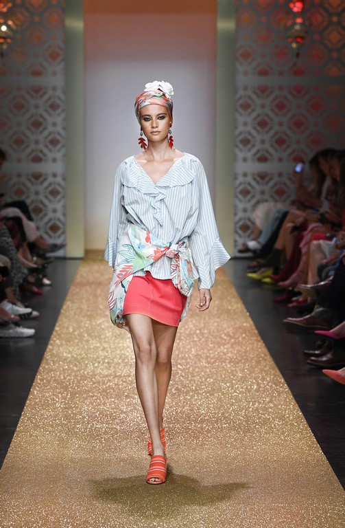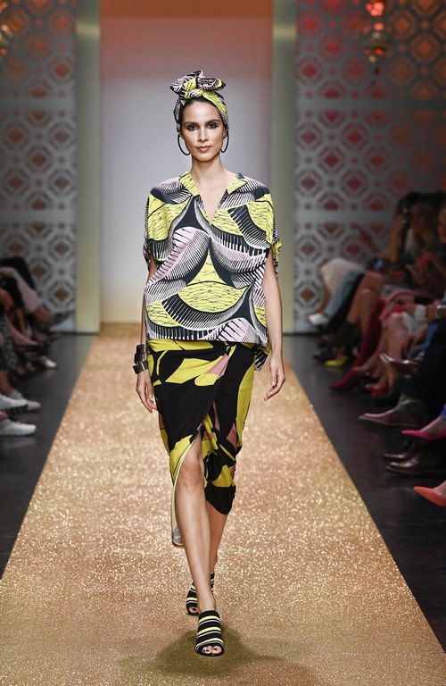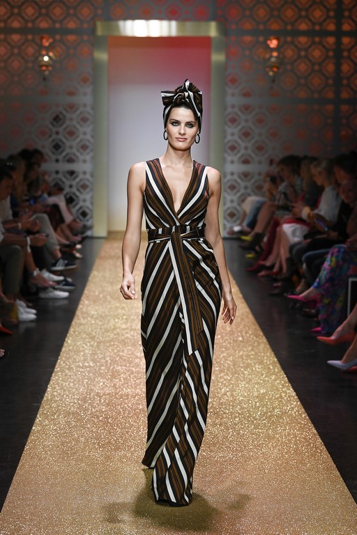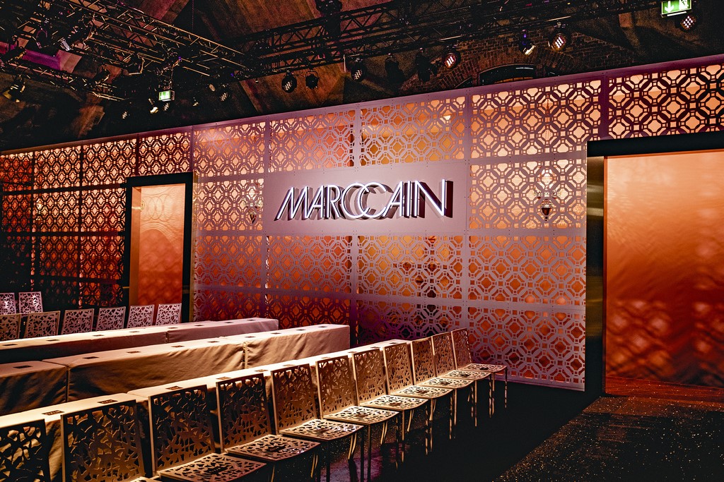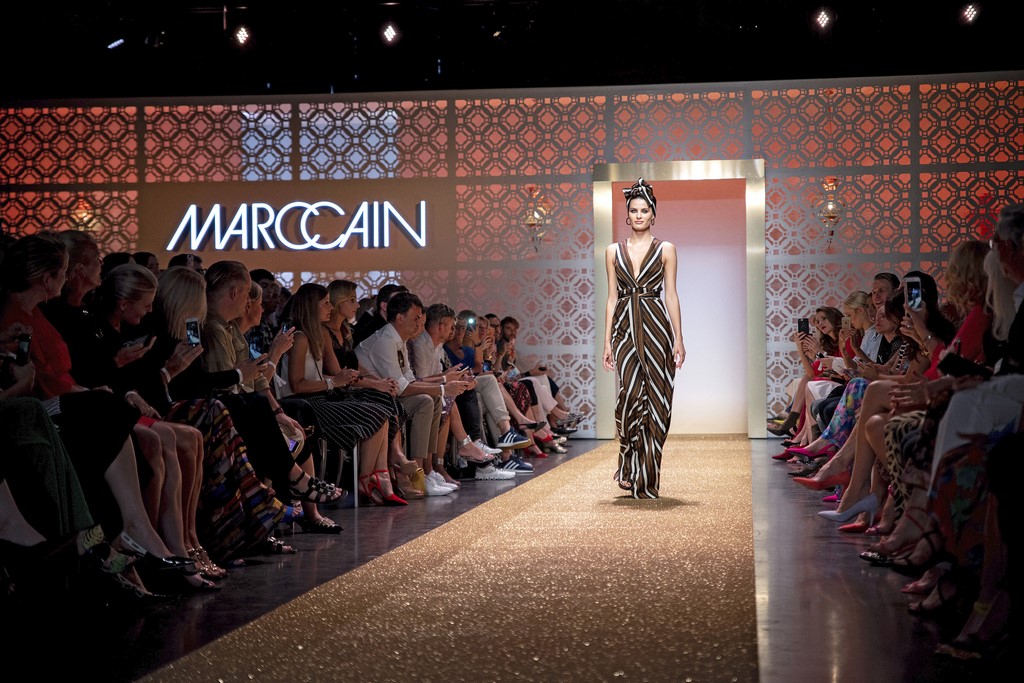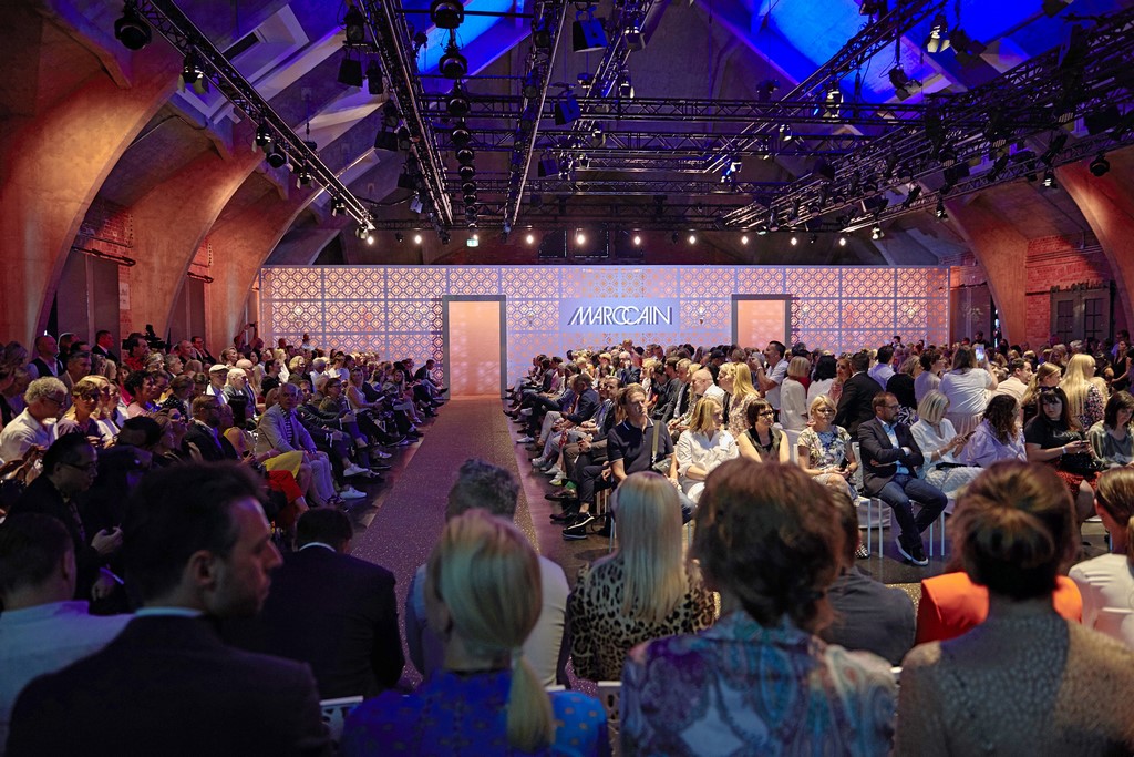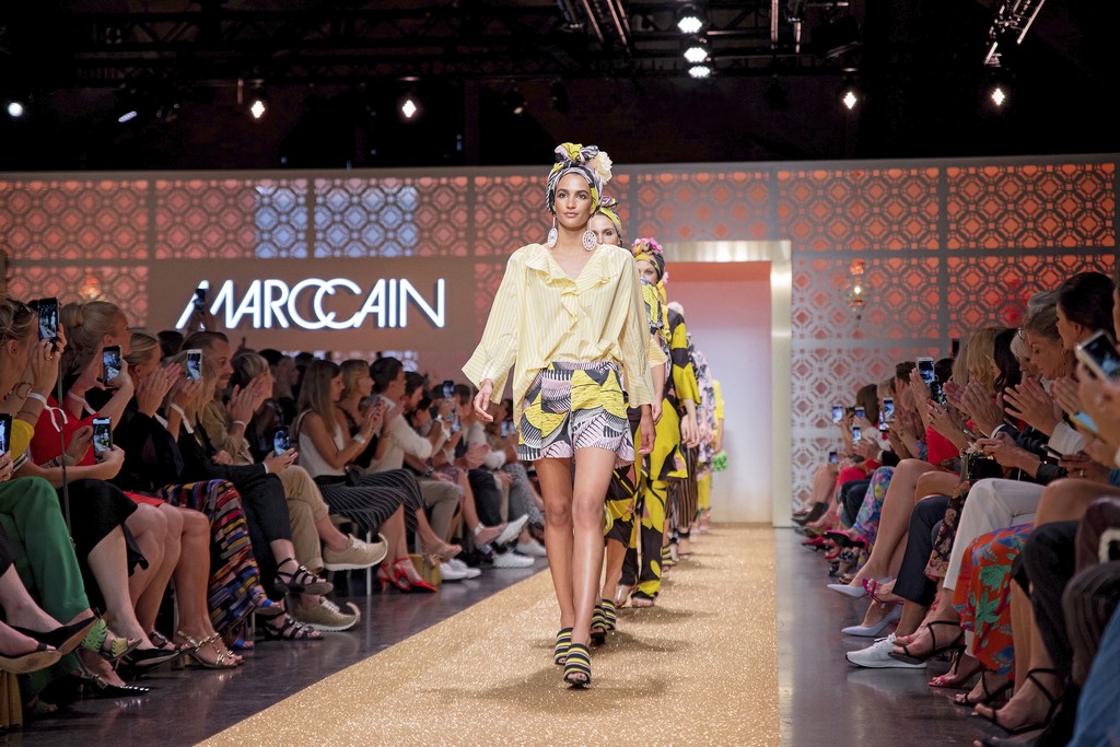 Marrakesch ist Sehnsuchtsort und Inspirationsquelle, und so ließ sich auch Marc Cain von diesem Charme inspirieren und präsentierte seine Fashion Show unter dem Motto „Le Riad Marc Cain“. Bei dieser standen eine starke Farbigkeit und der Einfluss aus verschiedenen Kulturen und Ethnien im Vordergrund. Besonders der afrikanische Kontinent diente als Inspirationsquelle für Muster, Designs und Details. Volants, Rüschen und Raffungen waren unverzichtbar für feminine, fließende Maxikleider. Dekorative Ohrringe, Turbane und bunte Haarbänder versprühten Sommer-Feeling. Die Verbindung aus marokkanischer Tradition und Moderne wurde unterstrichen durch einen goldenen Catwalk, schmückende Ornamente und stilisierte Portale. Die Farben Gold, Aqua, Sand und Weiß dominierten bei der Inszenierung.