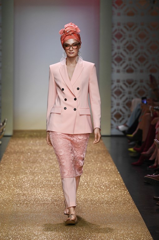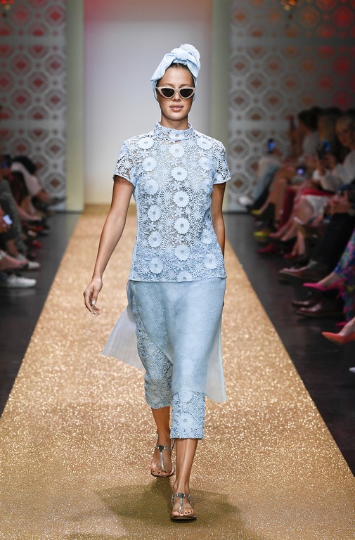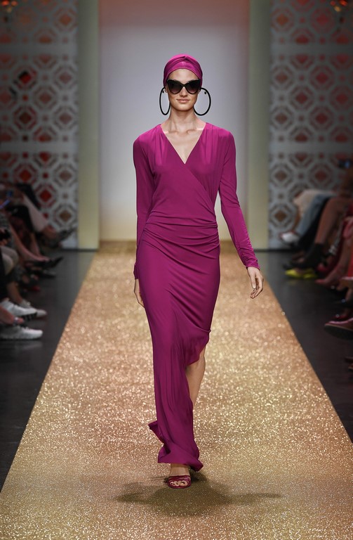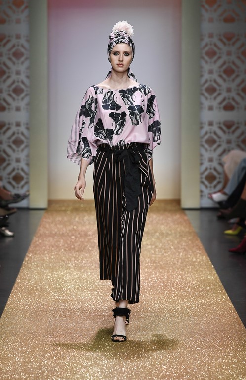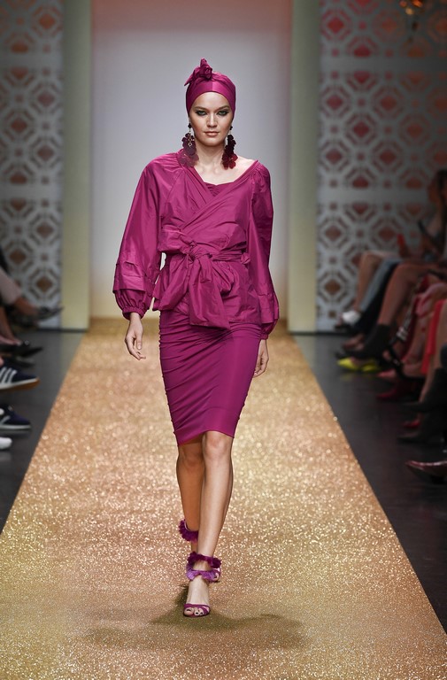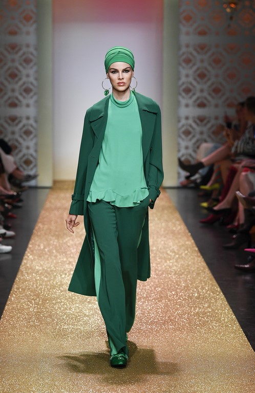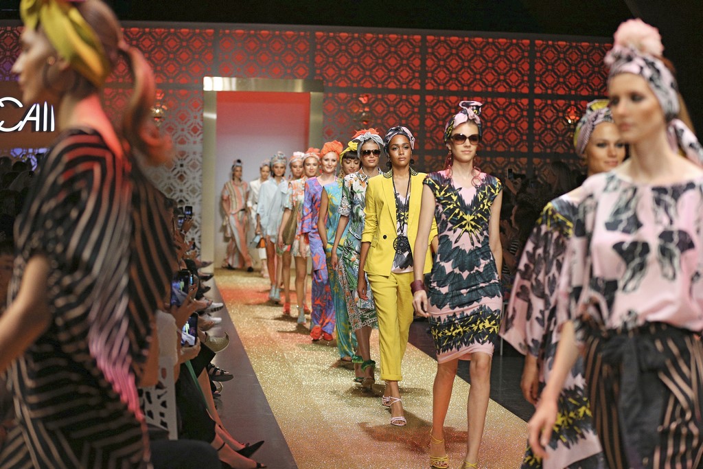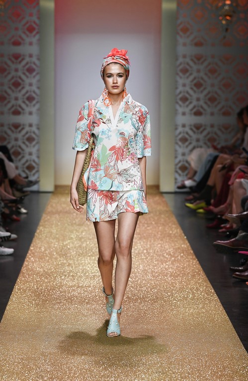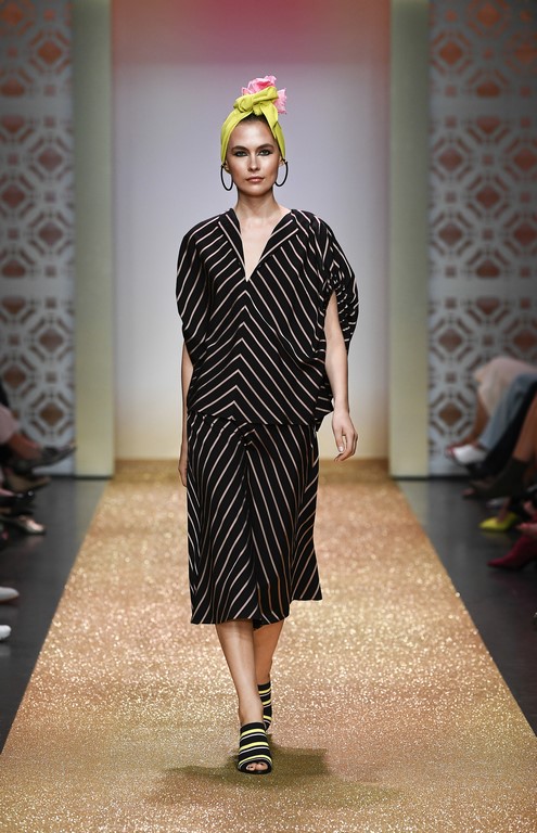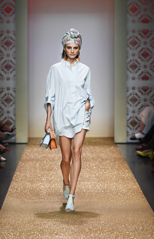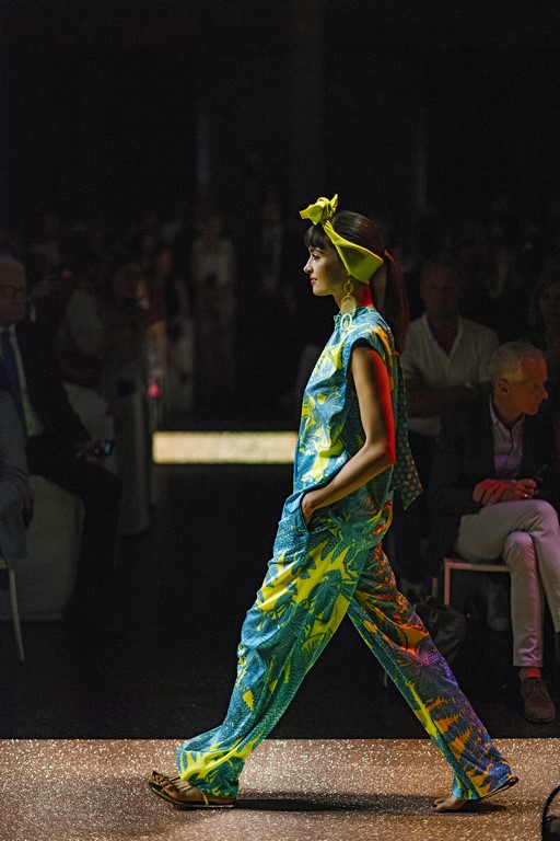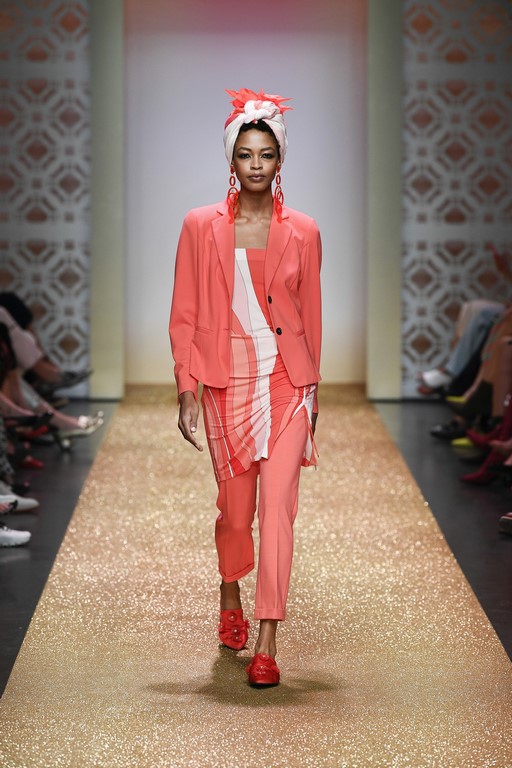 Marrakesch ist Sehnsuchtsort und Inspirationsquelle, und so ließ sich auch Marc Cain von diesem Charme inspirieren und präsentierte seine Fashion Show unter dem Motto „Le Riad Marc Cain“. Bei dieser standen eine starke Farbigkeit und der Einfluss aus verschiedenen Kulturen und Ethnien im Vordergrund. Besonders der afrikanische Kontinent diente als Inspirationsquelle für Muster, Designs und Details. Volants, Rüschen und Raffungen waren unverzichtbar für feminine, fließende Maxikleider. Dekorative Ohrringe, Turbane und bunte Haarbänder versprühten Sommer-Feeling. Die Verbindung aus marokkanischer Tradition und Moderne wurde unterstrichen durch einen goldenen Catwalk, schmückende Ornamente und stilisierte Portale. Die Farben Gold, Aqua, Sand und Weiß dominierten bei der Inszenierung.