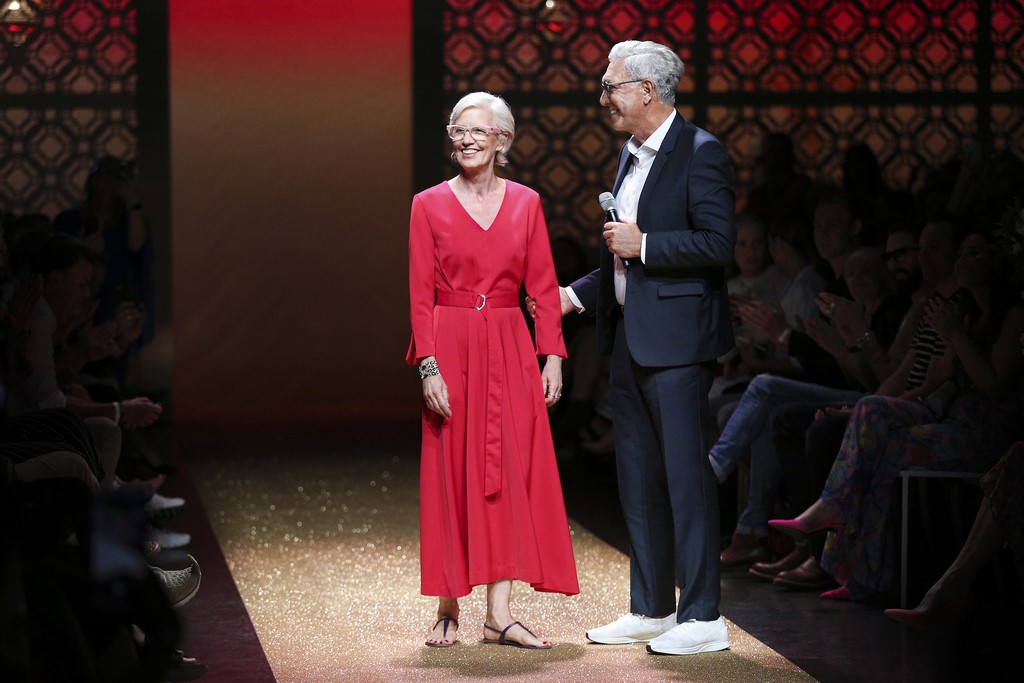 BERLIN, GERMANY – JULY 03: Karin Veit. chief designer Marc Cain and Helmut Schlotterer, Founder and CEO of Marc Cain during the Marc Cain Fashion Show Spring/Summer 2019 at WEEC, Westhafen, on July 3, 2018 in Berlin, Germany. (Photo by Gisela Schober/Getty Images for Marc Cain)