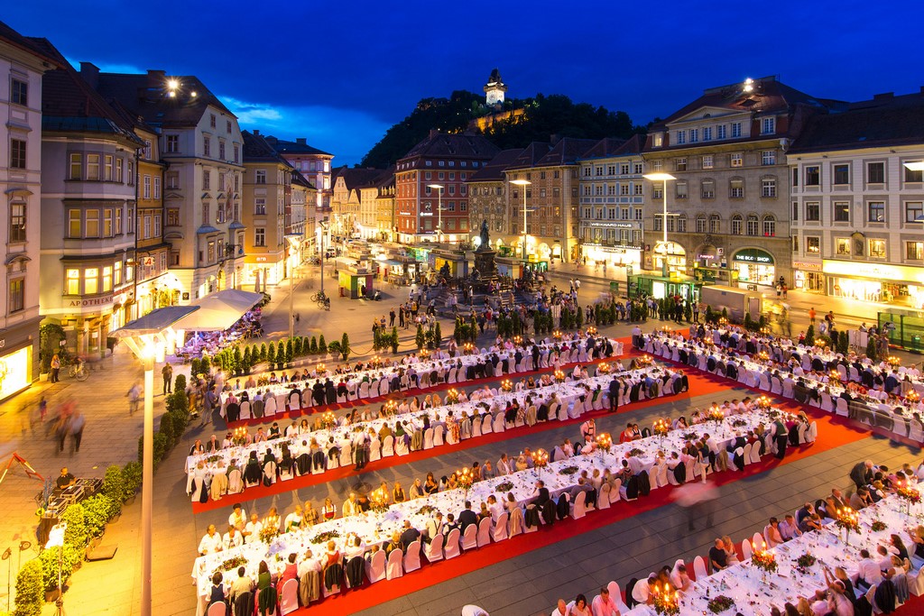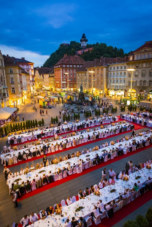 Bereits zum neunten Mal wird die LANGE TAFEL mitten in der Grazer Altstadt, vom Hauptplatz bis Mitte Schmiedgasse, festlich gedeckt. Blütenweißer Damast, silberne Kerzenleuchter, feines blitzblankes Besteck und strahlende Gläser, opulente Blumen- und Tischdekoration – Rathaus, Uhrturm und der Sternenhimmel als Kulisse – es ist alles vorbereitet für das herrliche Genuss-Erlebnis.