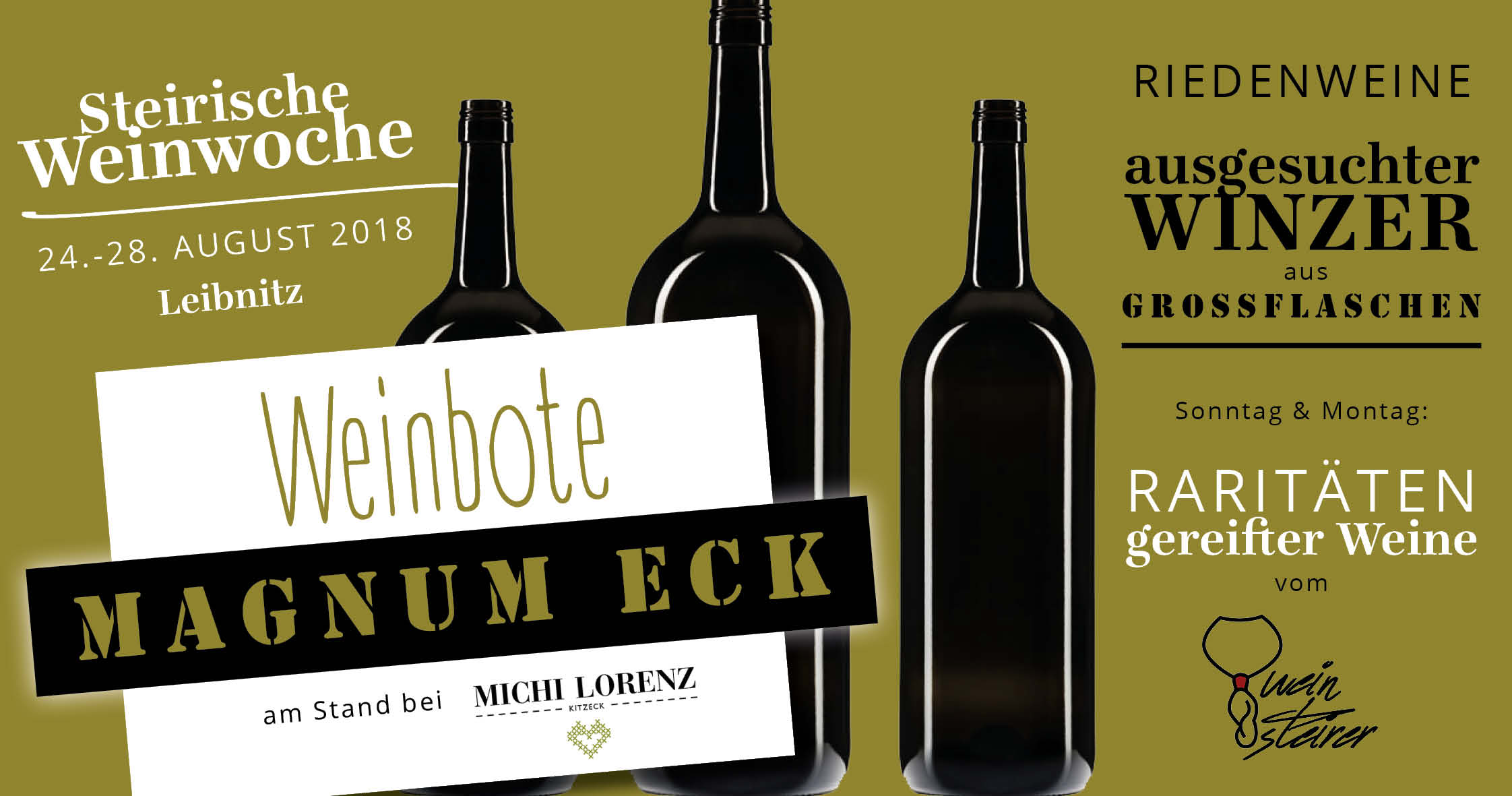 Zu finden ist das WEINBOTE MAGNUM ECK direkt beim Eingang (erster Stand rechts) beim Stand von Winzer Michi Lorenz. Sonntag und Montag begeistert außerdem „Wein Steirer“ Holger Massner mit seinen Raritäten gereifter Weine. Und Jahrgänge zurück bis in die Siebziger sind bei ihm keine Seltenheit!