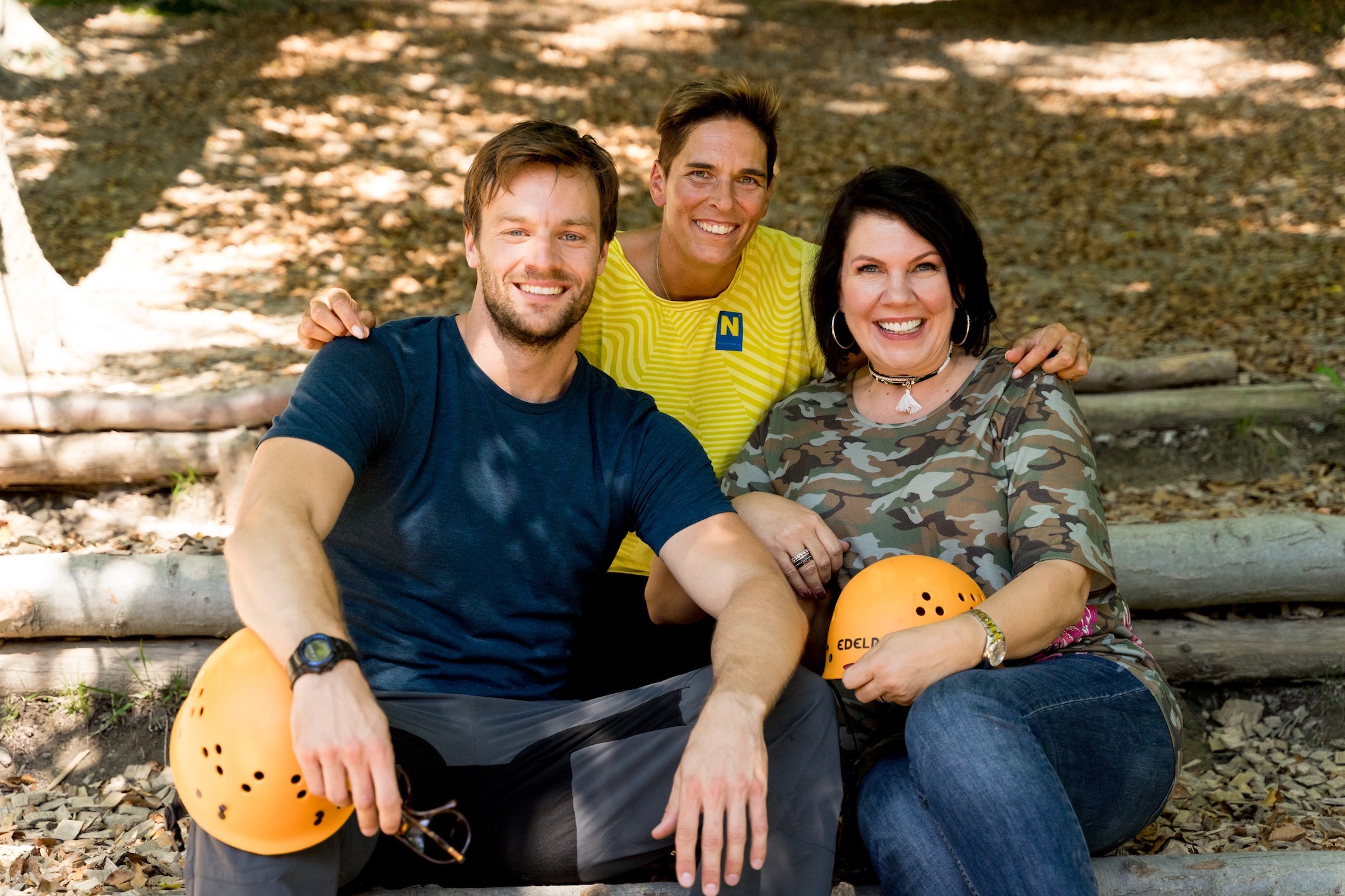 Großes Beitragsfoto: Die Gastgeber Profilerin Patricia Staniek, Olympiasiegerin Michaela Dorfmeister und Kletterpark-Chef Rüdiger Rader (Foto Andreas Hochgerner)
