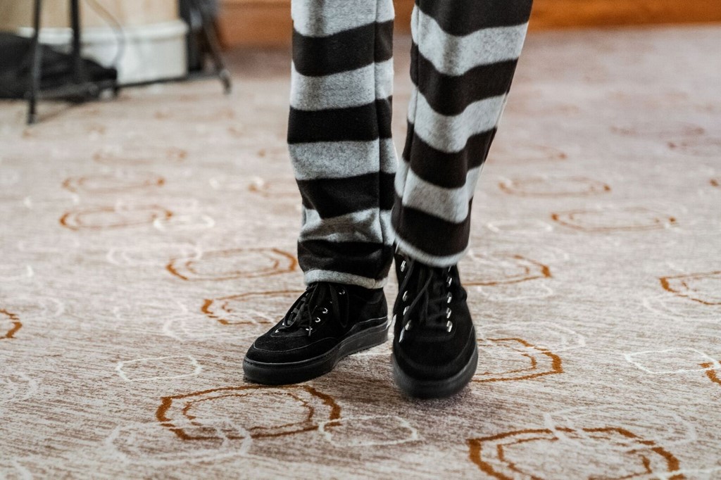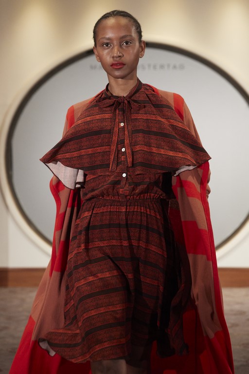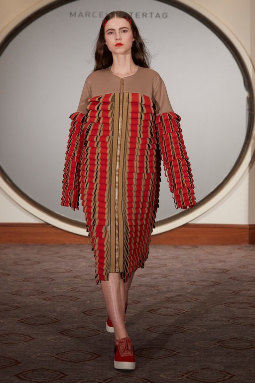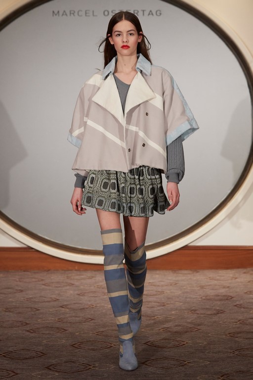 Zu seinen Kreationen werden große Kaschmirtücher mit All-Over Logoweberei und Schuhe aus der Marcel Ostertag X Tamaris Kollektion kombiniert.