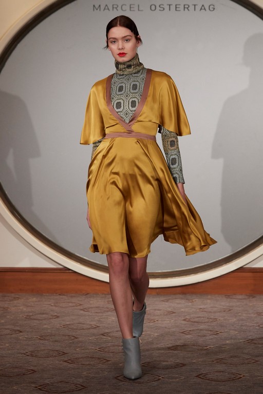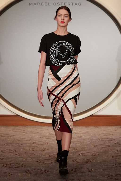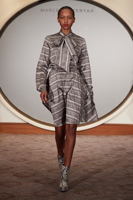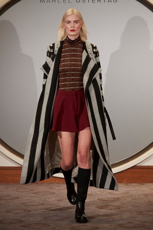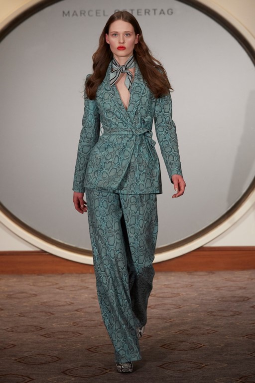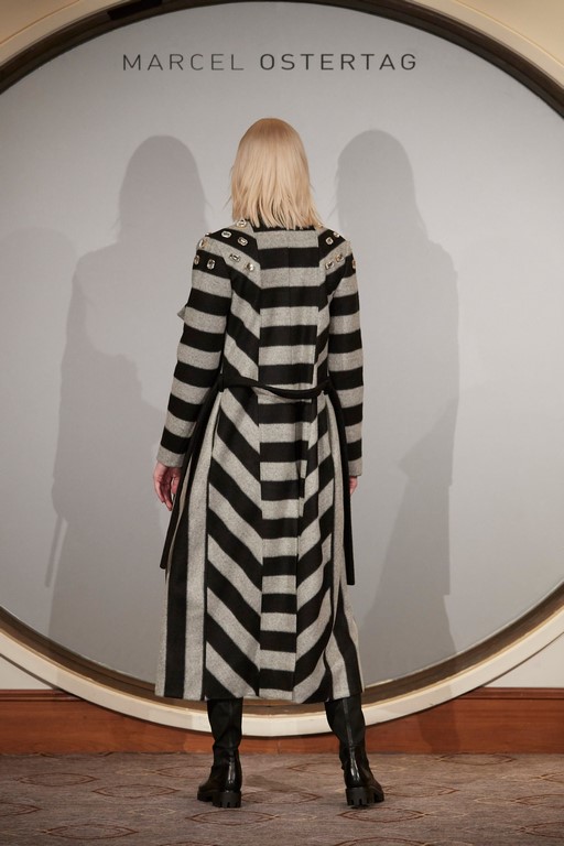 Marcel Ostertag begeisterte seine Kunden und Fans mit schwingenden Kleidern, Kaschmirmäntel, Blousons und Trenchcoats aus Fake-Fur. Streifenmuster mixte er mit verschiedenen Schlangenprints – alles Eigenkreationen. Dazu trugen die Models natürlich All-Over Logoweberei und Schuhe aus der Marcel Ostertag x Tamaris Kollektion.