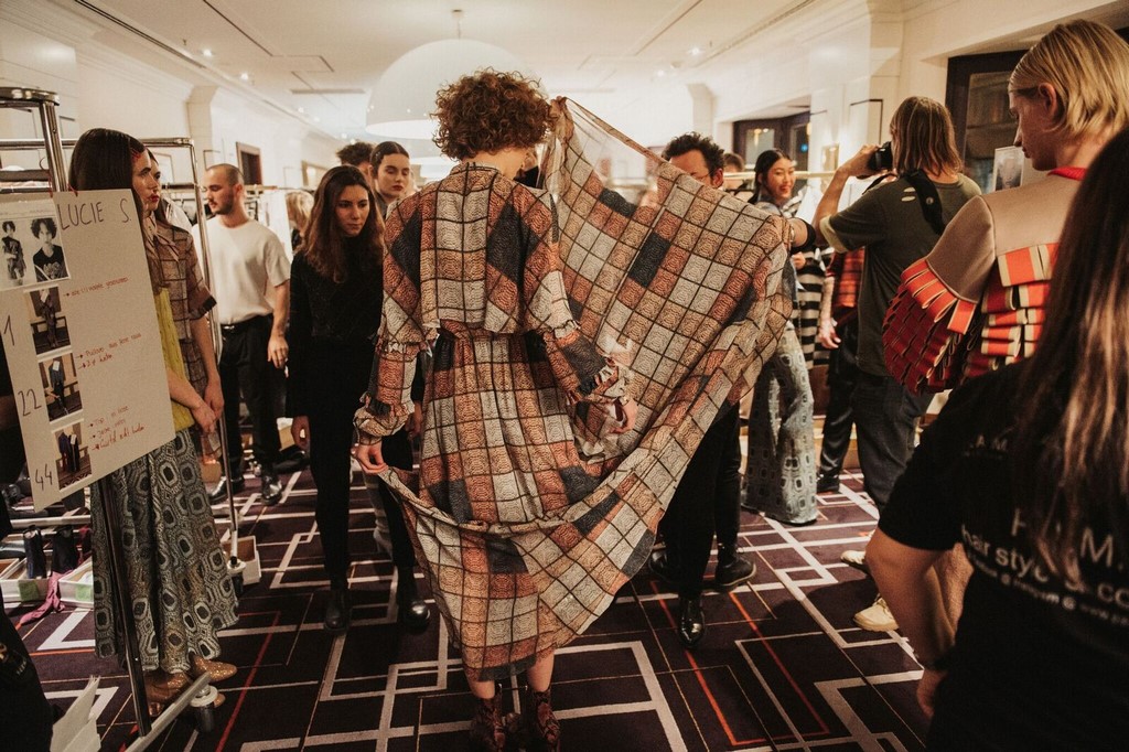 Im eleganten Rahmen des Hotels „Westin Grand“ präsentierte Marcel Ostertag flatternde Kleider, die verschiedene Prints vereinen (Foto Getty Images)