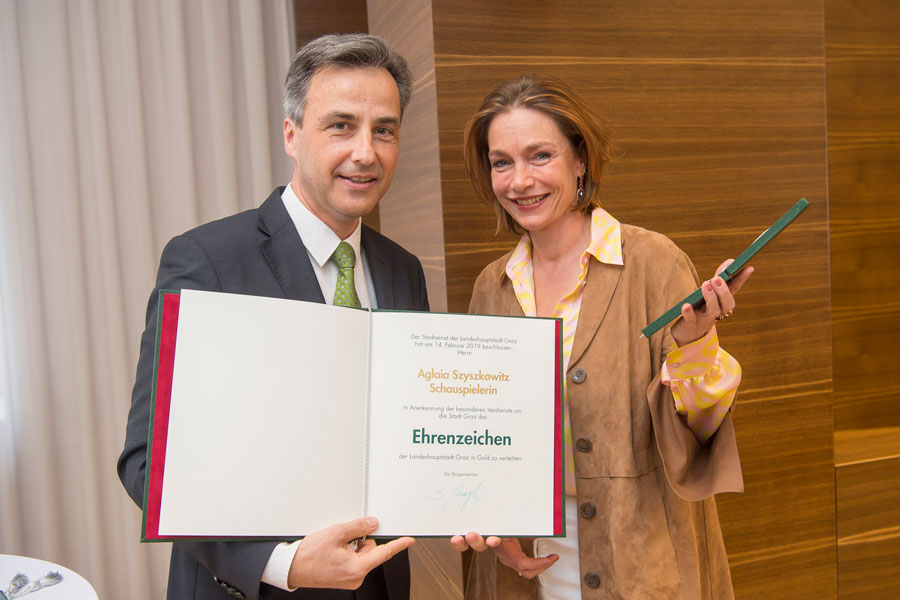 Aglaia Szyszkowitz begann ihre Dankesworte mit „Lieber Herr Bürgermeister, liebe Stadtregierung. Jetzt, wo ich hier im Rathaus stehe, wird mir erst klar, welche Ehre und Freude es ist, von meiner Geburtsstadt ausgezeichnet zu werden. In Graz, wo ich mit meinem Großvater als Kind im Stadtpark Hansis gefüttert habe, mit meiner Mutter am Thalersee Schlittschuhfahren lernte und uns der Vater an jedem Wochenende die Schöcklseilbahntrasse hochgejagt hat. In diesem Graz habe ich eine warme, ungetrübte Kindheit im Schoße meiner Familie erleben dürfen. Tiefes Vertrauen ins Leben, das verdanke ich auch dieser Stadt.“