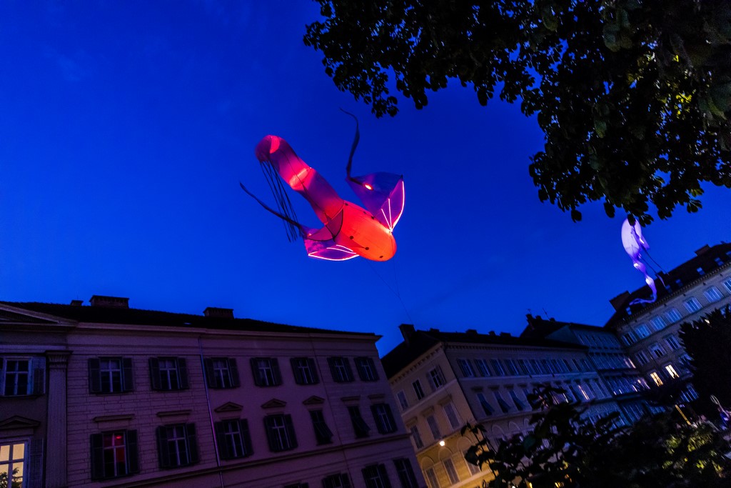 Zum fünften Jubiläum von Klanglicht wraen auch wieder „Les Luminéoles“ des französischen Kollektivs Porte par le Vent dabei: Bereits 2017 flogen ihnen die Herzen der Besucher entgegen, bei Klanglicht 2019 schwebten die poetischen Flugwesen nun zauberhaft wie eh und je durch den Nachthimmel über dem Opernring.