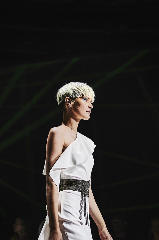 The staging showed an exciting, unique play of light and colours, which was projected on 15m-long thread curtains around the whole location. With the unique worldwide “Visual Piano“, the international light artist Kurt Laurenz Theinert created impressive graphic patterns in real-time. These took over the complete space and whisked guests off into an abstract world of lines of light. The 56m long zebra-striped catwalk featured renowned models such as Caroline Winberg, Kris Gottschalk and Kenya Kinski-Jones, the daughter of Nastassja Kinski and Quincy Jones. With an interior of over 3,000 sqm, the Berlin Velodrom is the largest location to have hosted a Marc Cain Fashion Show so far.