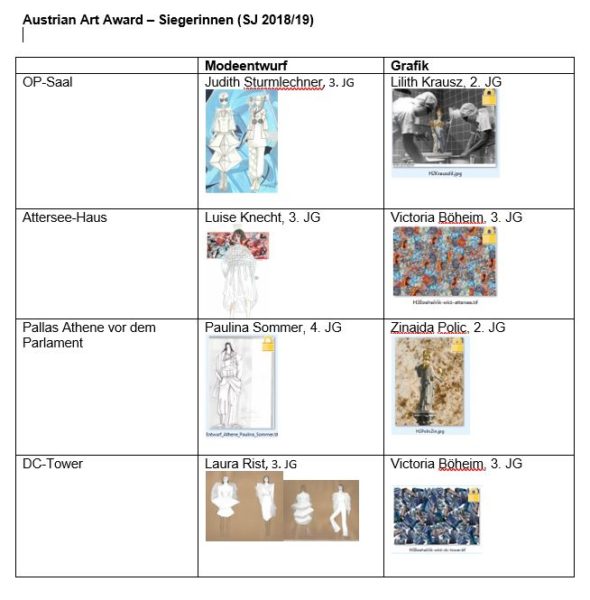 Der AUSTRIAN ART AWARD DFG 2019 in der Kategorie Angewandte Kunst ging an 7 Studenten der Modeschule Wien im Schloss Hetzendorf sowie in der Kategorie Darstellende Kunst & Komposition an 5 Studenten der Musik und Privatuniversität der Stadt Wien (MUK) die in den Denkmal-, Fassaden- und Gebäude-reiniger ART IMAGE KAMPAGNEN Filmen unter der Regie von Ludwig Christian Attersee mitwirken werden: