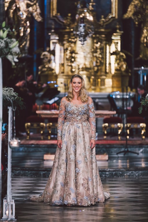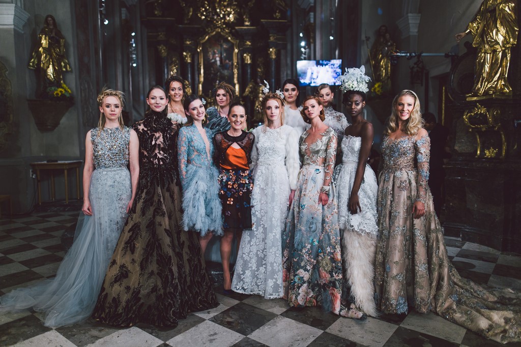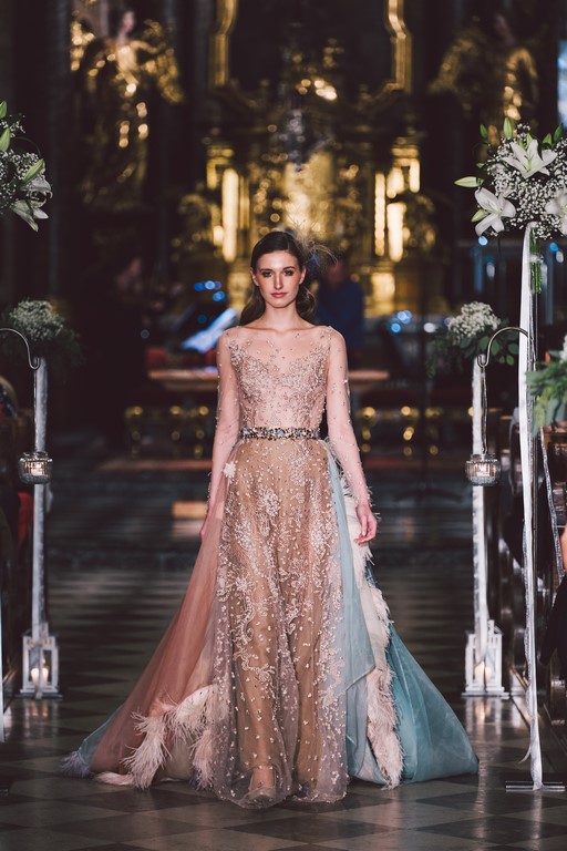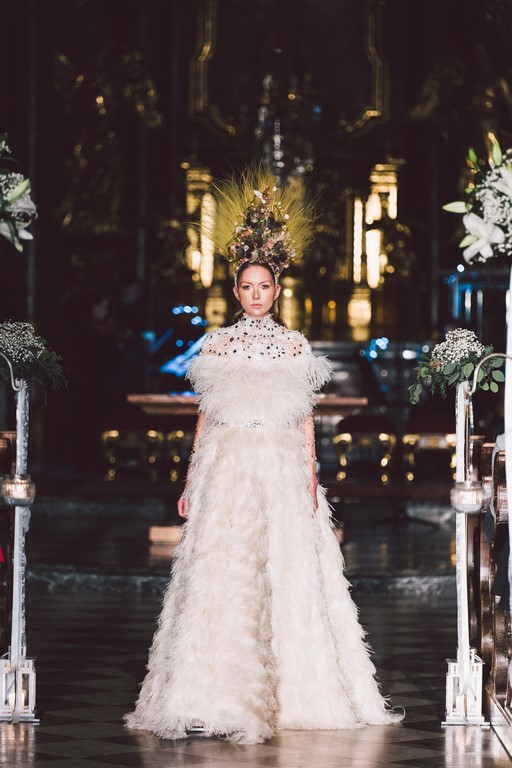 In einer unglaublich beeindruckenden Inszenierung ließ sie ihre Models mit ihren wundervollen Roben durch die Kirche schreiten. Dabei wurde die gesamte Stadtpfarrkirche mit zarten Visual-Elementen von Jürgen Erbler und Jan Schütz (Erbler Medien-technik) bestrahlt. Die dazu passenden harmonischen Klänge von Hermine Pack und die Roben der Designerin – in feiner Handarbeit bestickte Stoffe, Tüll, Spitze und Federn – erzeugten eine einzigartige und in der Form noch nie da gewesene Kulisse.