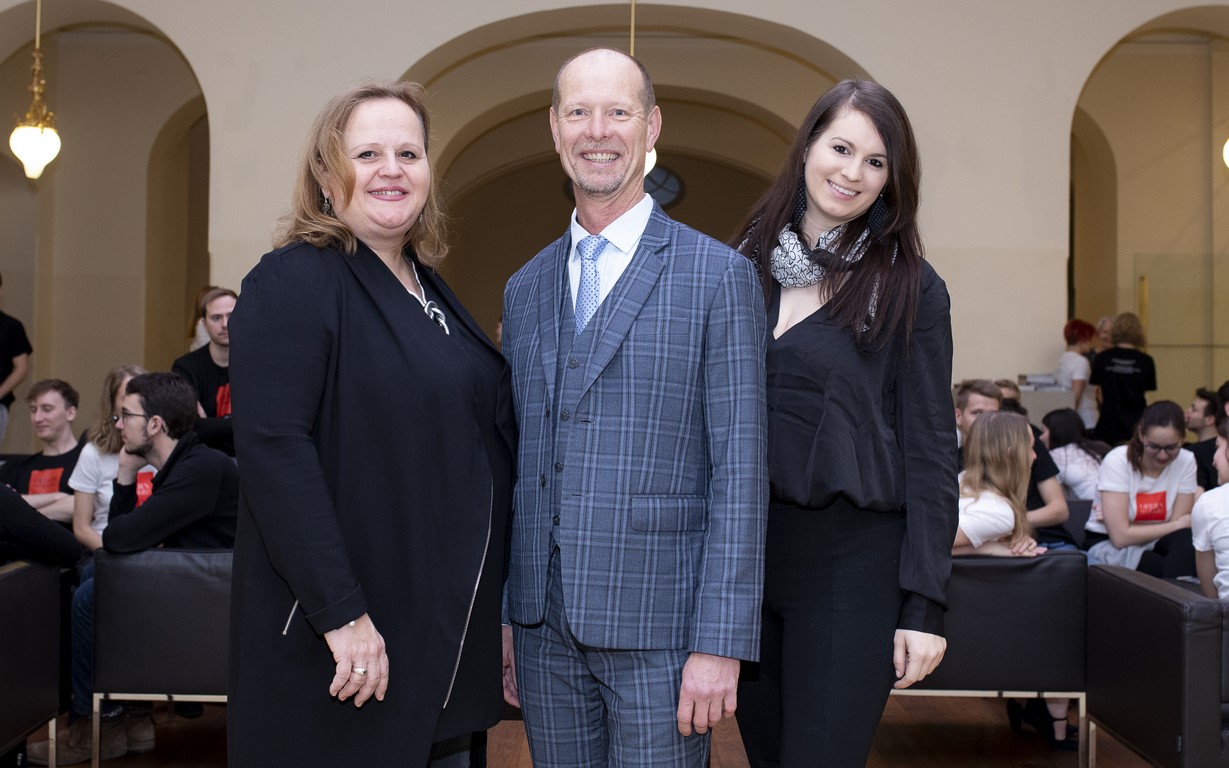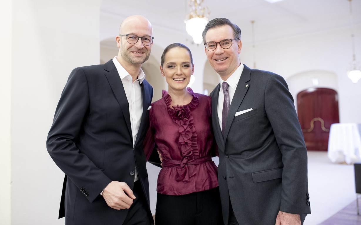 Großes Beitragsfoto: Überreichung der Krönchen an die Debütantinnen der Grazer Opernredoute: Organisator der Grazer Opernredoute Bernd Pürcher, Designerin Eva Poleschinski und Juwelier Klaus Weikhard. (Foto Opernredoute / Marija Kanižaj)