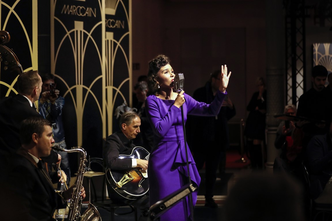 Passend zum Thema des Abends war der Saal mit opulenten Kronleuchtern, Orchideenblüten sowie Platzgedecken mit gold-farbenen Details geschmückt. Die Models, unter ihnen die Kanadierin Heather Marks, flanierten entlang des kurvigen Catwalks, der sich zwischen den Bankett- und Bistrotischen hindurchschlängelte. Während Schauspieler und Synchronsprecher Sascha Rotermund als Moderator charmant durch den Abend führte, sorgten „Andrej Hermlin and his Swing Dance Band“ für die musikalische Untermalung.