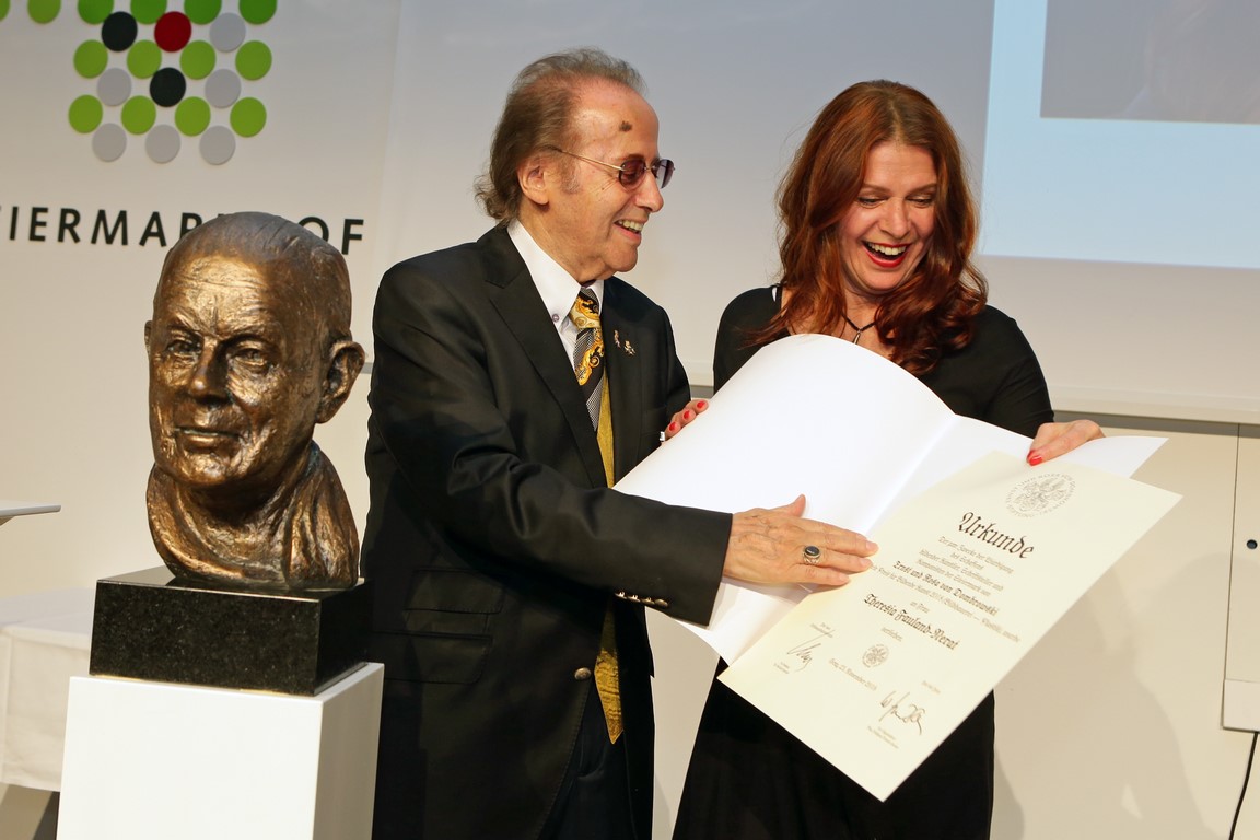 Die wohl wichtigste Auftragsarbeit erhielt sie 2013 von der Vereini-gung der österreichischen Staatsanwältinnen und Staatsanwälte. Sie wurde mit der Planung und Ausführung der Preisträger Skulptur des ,Wolfgang Swoboda Preis für Menschlichkeit im Strafverfahren‘ beauftragt. Entstanden ist eine Skulptur aus Eisenguss in einer Auflage von 11 Stück. „Bei der ersten Preisverleihung 2014 im Obersten Gerichtshof in Wien an Karl Markovics war ich sehr aufgeregt. Ich hatte die Ehre, nach dem Justizminister eine Rede an die Festgäste zu halten. Darin habe ich den kreativen und aus-führenden Prozess zur Entstehung der Skulptur erklärt.“ Der Preis wird fast jährlich überreicht und Theresia freut sich, als Ehrengast dem Festakt immer bei wohnen zu dürfen.