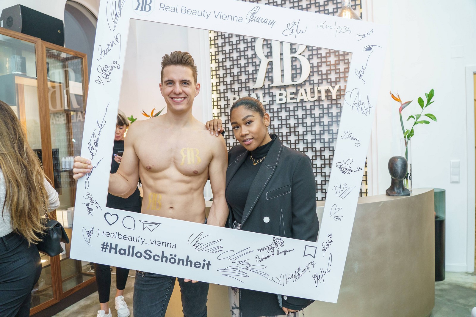 Großes Beitragsfoto: Mister Austria Philipp Knefz und Guess-Testimonial Nadine Mirada feierten die Eröffnung des Real Beauty Schönheitssalons – und Geschäftsführerin Rodica Popa feierte gleichzeitig auch ihren Geburtstag. (Foto Andreas Tischler)