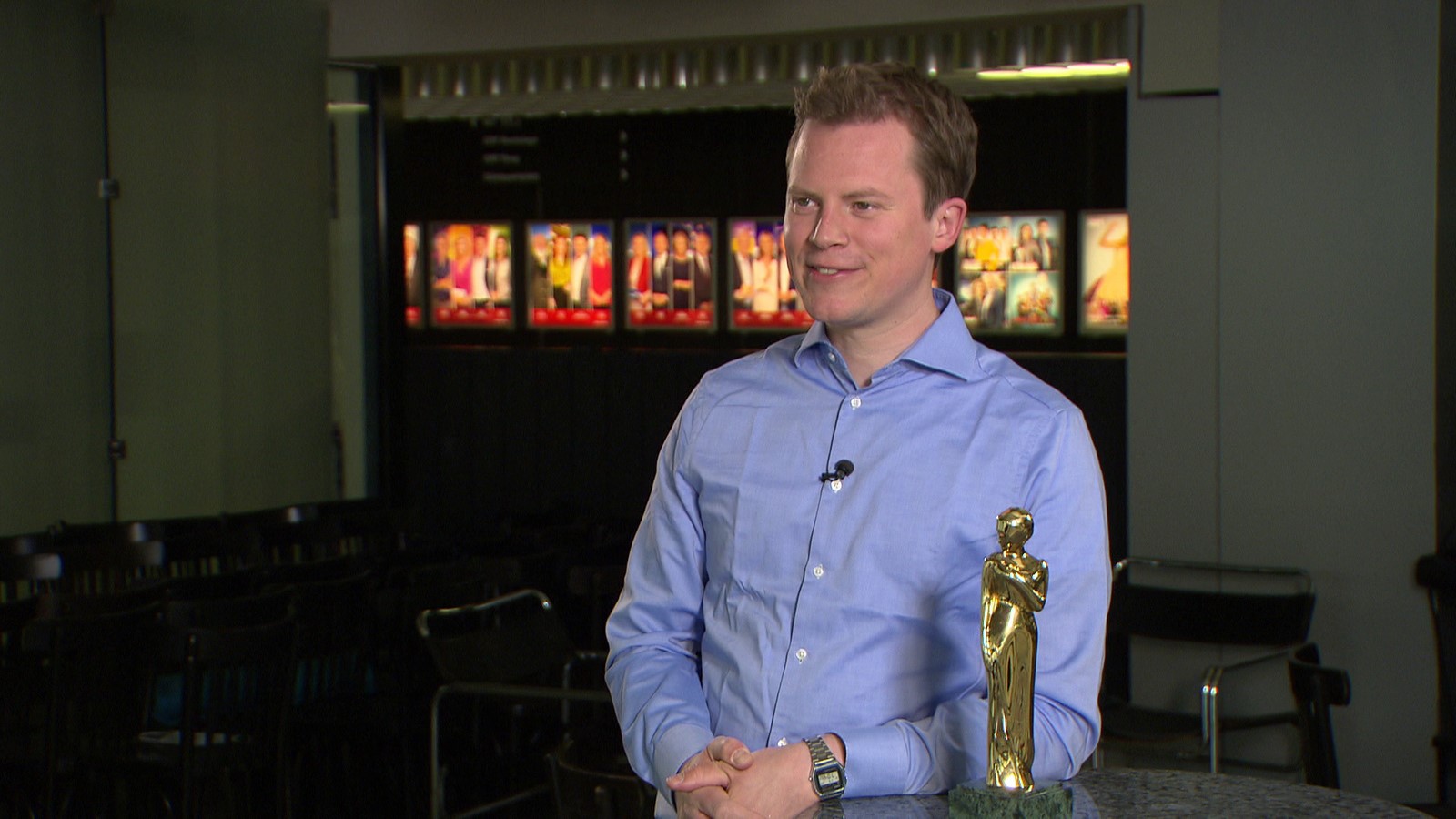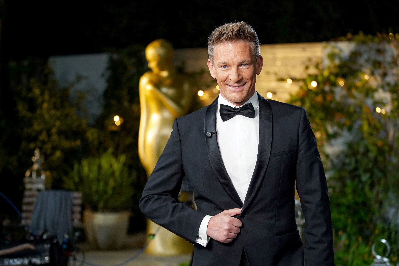 Großes Beitragsfoto: Andi Knoll überraschte heuer die Preisträger vorab in verschiedensten Situationen mit der begehrten Trophäe – hier Schau-spieler Jakob Seeböck. (Foto ORF)