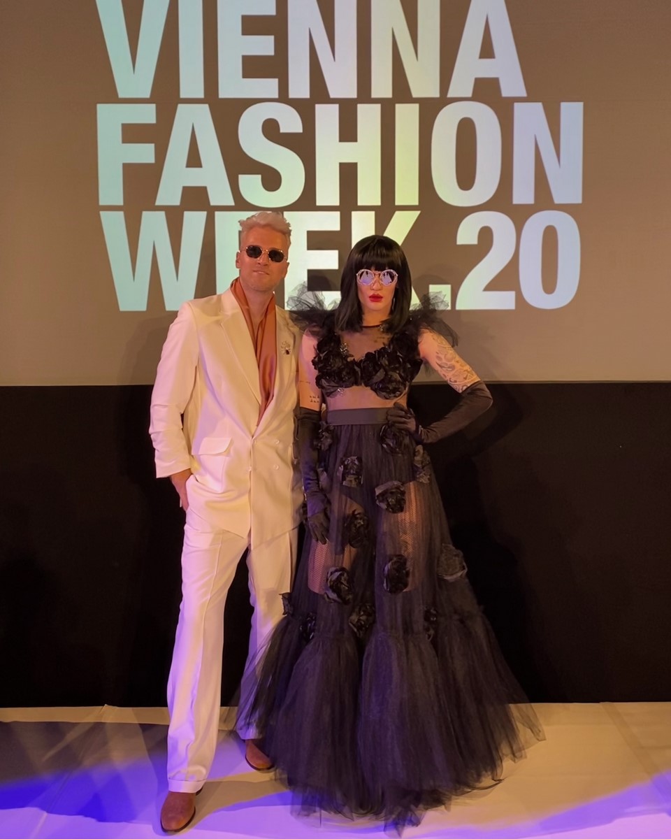MQVFW 2020: Designer Niko Niko mit Drag Queen Gloria Hole. (Foto Gloria Hole)