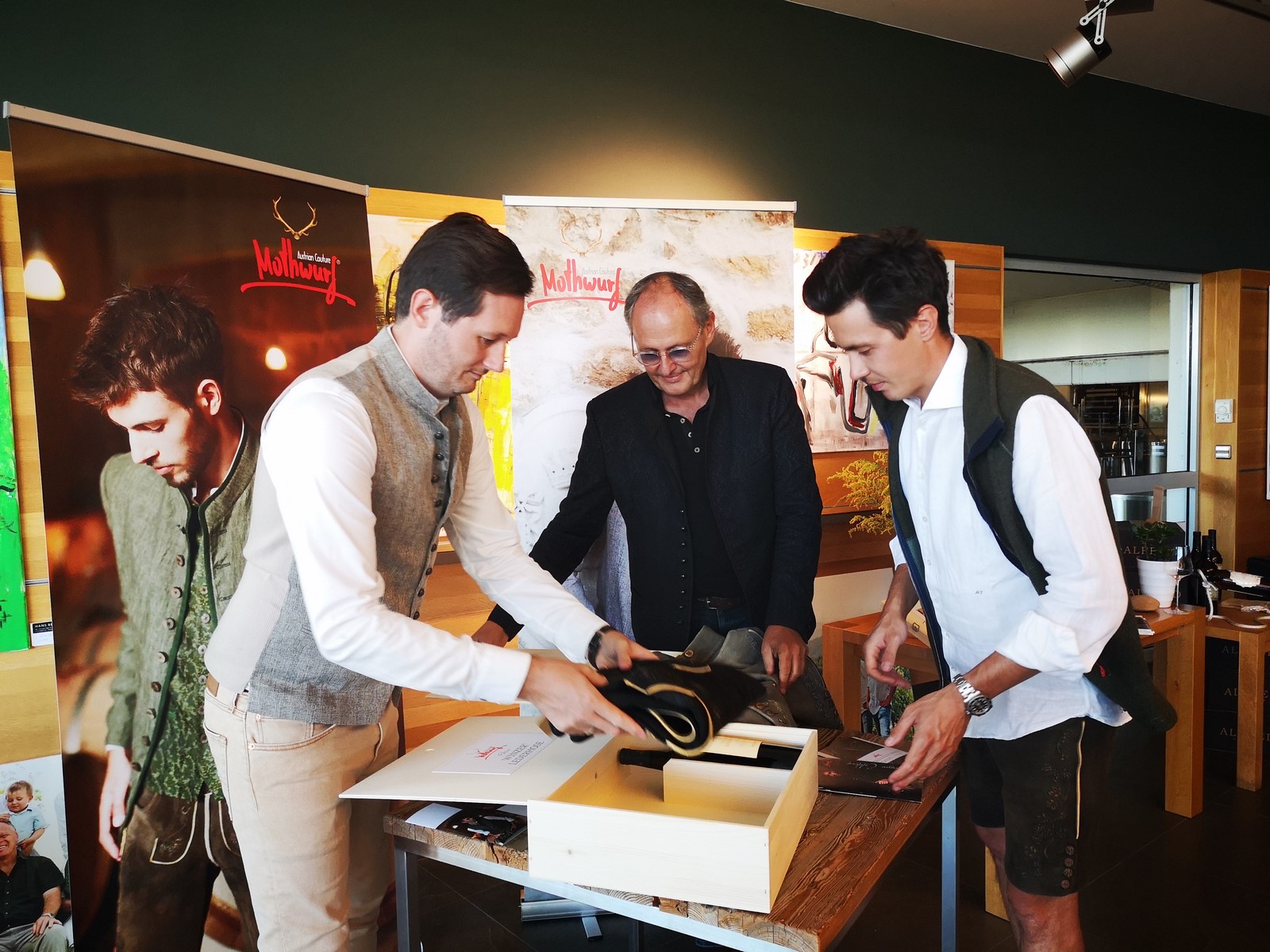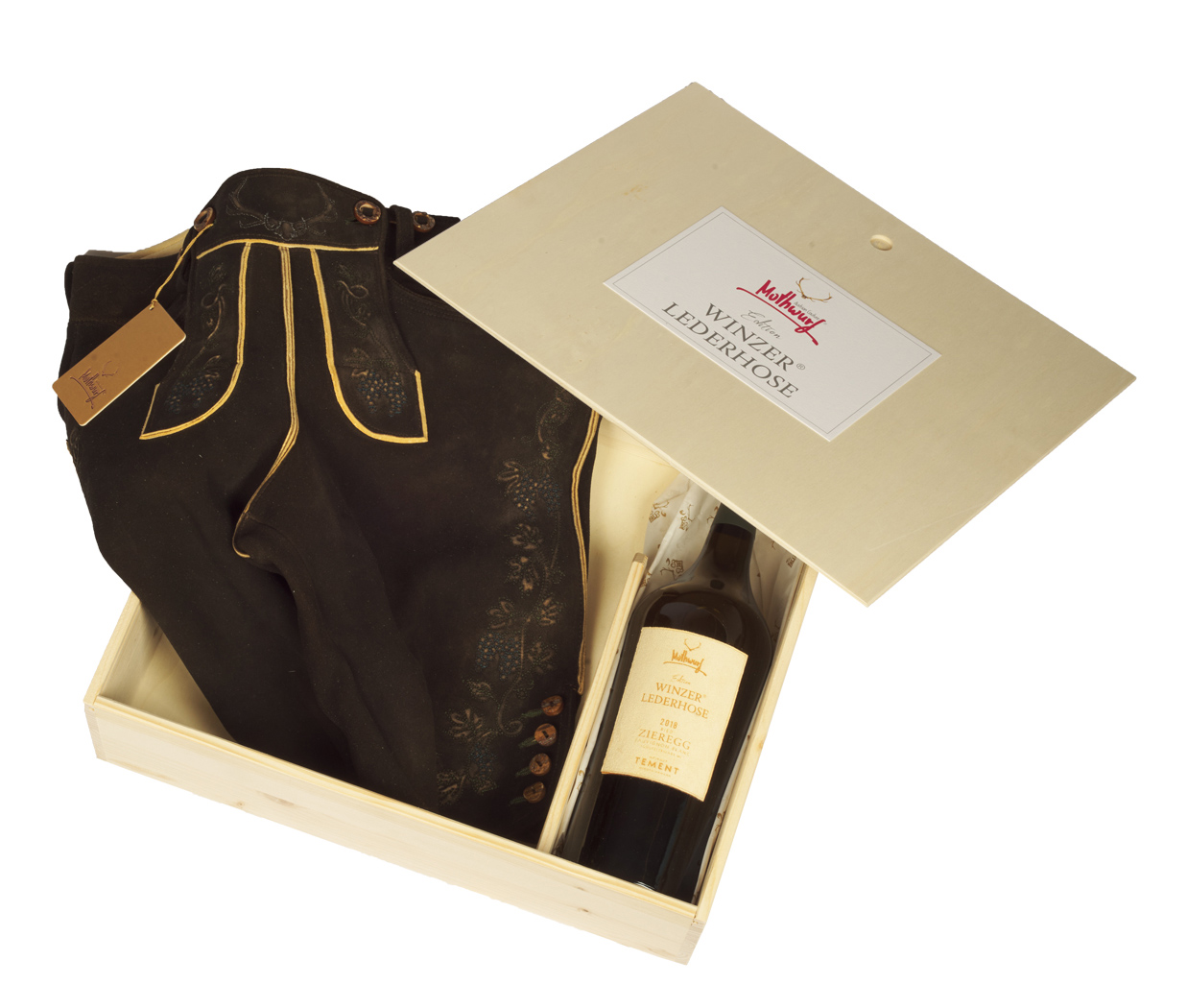 Mothwurf Winzer Lederhose aus Hirschleder. Box Weingut Tement. (Foto Mothwurf)