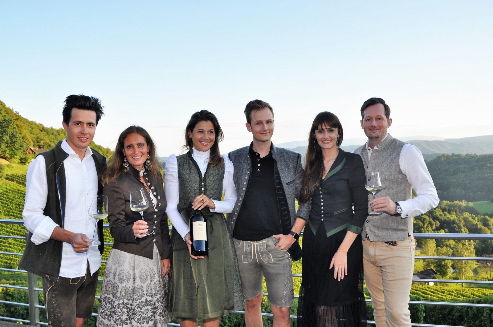 Präsentation der steirischen Winzer-Lederhose®: Helmut Schramke, Armin und Monika Tement, Mathis Schramke, Anna Mayer und Dominik Schramke. (Foto Reinhard Sudy)