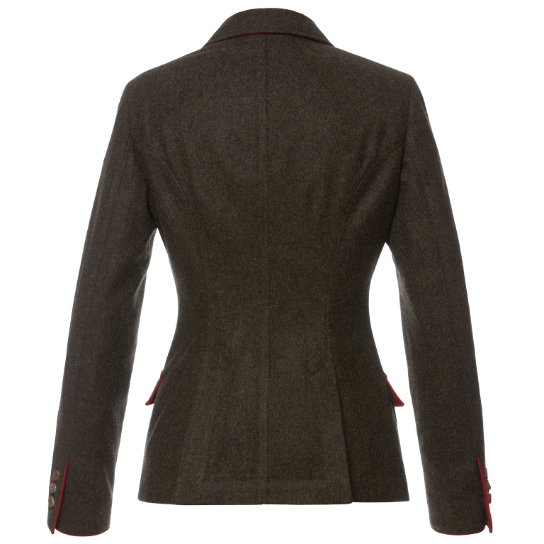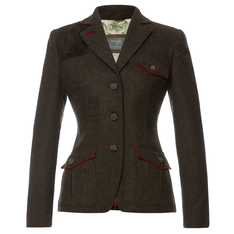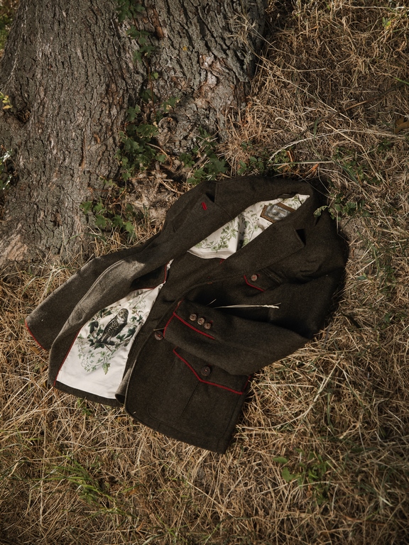 Gewohnt feminin – typisch Lena Hoschek, erfüllt die klassisch geschnittene Jacke durch bewegungsfreundliche Verarbeitung alle funktionellen Aspekte und besticht vor allem durch zeitlose Ästhetik und prachtvolle Details. Sofort ins Auge stechen dabei der Unterkragen und die Paspelierung der Jacke in Signal-Rot. Wirft man einen Blick auf das Innenfutter, wird die herausragende Handwerkskunst und unverkennbare Liebe zum Detail einmal mehr sichtbar. Motive aus Wald und Wiese finden sich auf einem platzierten Stoffdruck und zieren das außergewöhnliche Innenfutter der Jacke. Von österreichischen Trachten inspirierte Innentaschen runden das jagdliche Innenleben des Modells ab.
