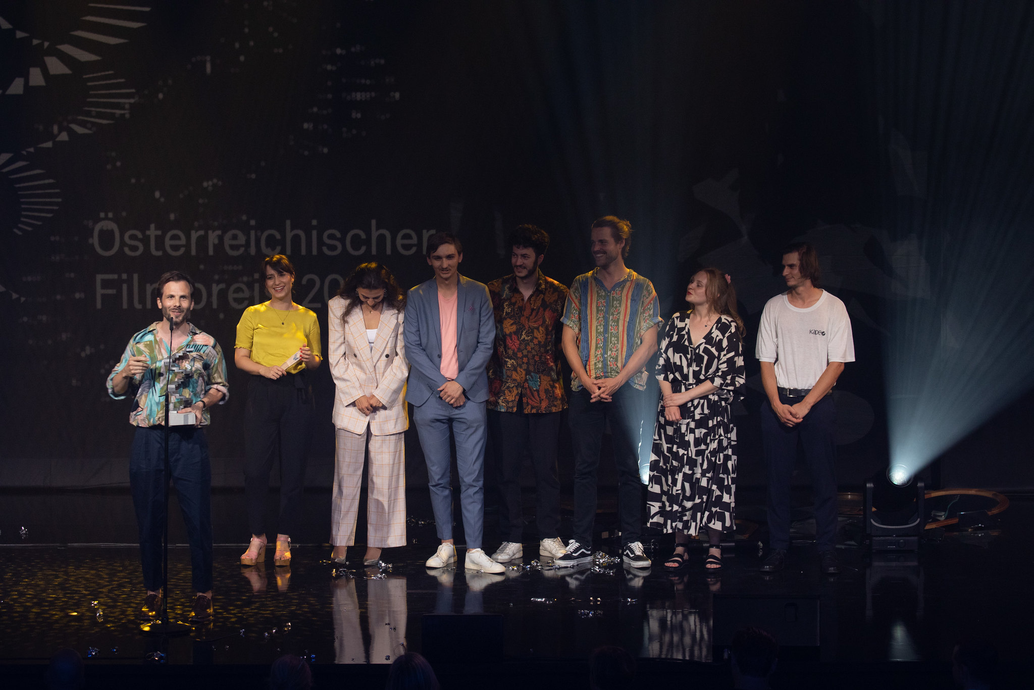 Der gemeinschaftliche Aspekt des Filmemachens stand im Mittelpunkt der Gala, und so führten die Riahi Brothers, die zu Beginn das Motto „Wir sind Kino“ ausgaben, mit einem bunten Ensemble durch den Abend: Auf der Bühne wurden sie von den Schauspielerinnen Barča Baxant, Michaela Schausberger, Joy Alphonsus, Rabie Peric und Elena Wolff, dem Schauspieler/ Drehbuchautor Faris Rahoma, der Kamerafrau Astrid Heubrandtnersowie dem Produzenten Peter Rommel unterstützt.