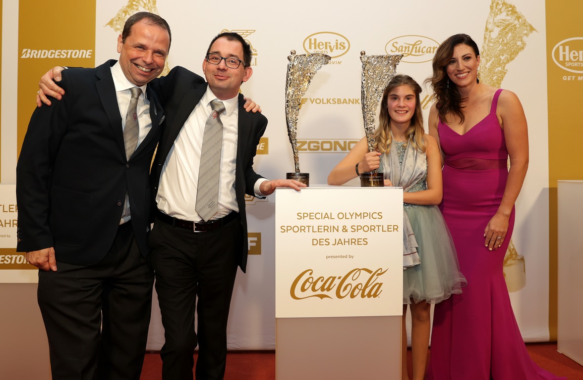 Sarah-Maria Baumegger und Alexander Flechl sind die „Special Olympics Sportler des Jahres 2021. Im Bild Philipp Bodzenta (Coca Cola), Alexander Flechl, Sarah-Maria Baumegger und Mirna Jukic. (Foto GEPA pictures/ Walter Luger)