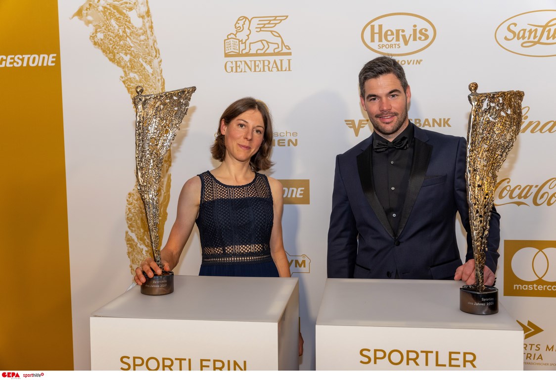 Großes Beitragsfoto: LOTTERIEN SPORTHILFE GALA 2021: Anna Kiesenhofer und Vincent Kriechmayr mit den „Niki“-Trophäen. (Foto GEPA/Sporthilfe)