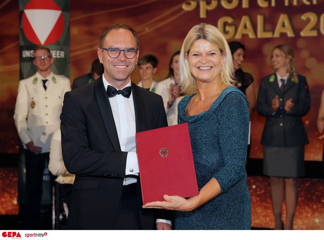 VIENNA,AUSTRIA,14.OCT.21 – VARIOUS SPORTS, SPORTHILFE – LOTTERIEN Sporthilfe-Gala, election of Austrian Sports Personality of the Year. Image shows minister of defense Klaudia Tanner and Jakob Schubert (AUT). Photo: GEPA pictures/ Walter Luger