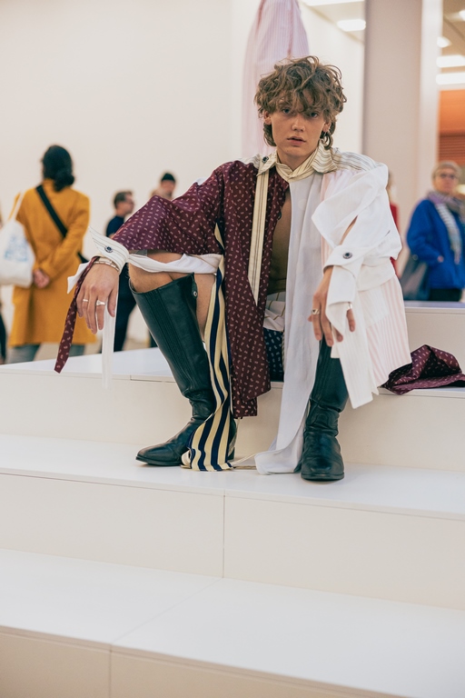 In der von Miriam Hie moderierten Preisverleihung, zeichnete Mag.a Olga Okunev, Referatsleiterin Sektion IV Bildende Kunst, Architektur, Design, Mode, Fotografie und Medienkunst beim Bundesministerium für Kunst, Kultur, öffentlichen Dienst und Sport, Modedesigner PETAR PETROV mit dem outstanding artist award für experimentelles Modedesign des BMKÖS aus. Mag.a Veronica Kaup-Hasler, amtsführende Stadträtin für Kultur und Wissenschaft verlieh den Modepreis der Stadt Wien an Jojo Gronostay mit seinem Label DEAD WHITE MEN´S CLOTHES.