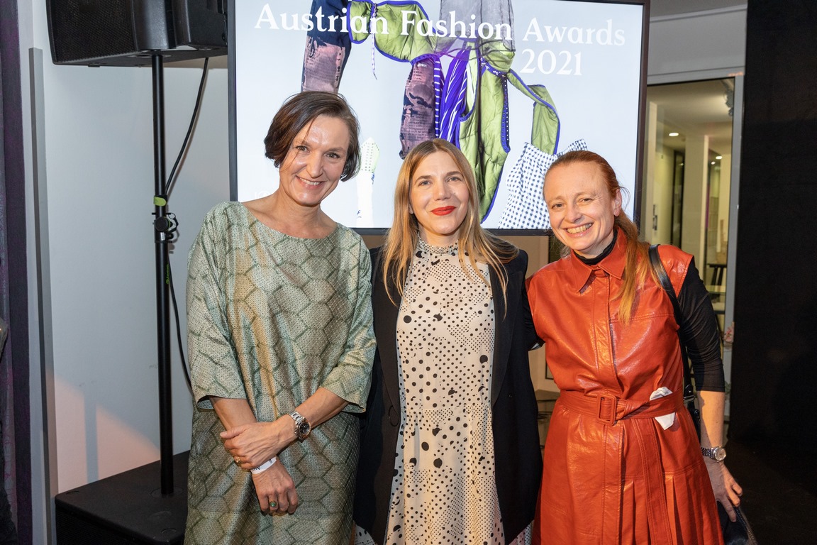 Großes Beitragsfoto: Camilie Boyer, Obfrau Austrian Fashion Association, Preisträger Designer Petar Petrov und Mag.a Veronica Kaup-Hasler, amtsführende Stadträtin für Kultur und Wissenschaft. (Foto Thomas Lerch)