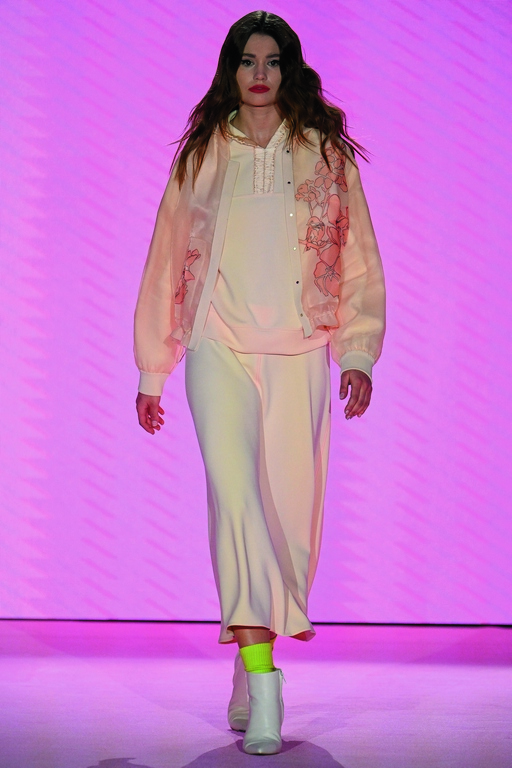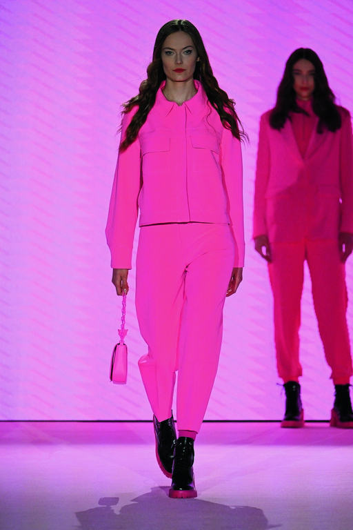 Der Abend stand unter dem Eindruck des aktuellen Zeitgeschehens und des Krieges. Marc Cain war es wichtig, die neuen Kollektionen zu präsentieren, aber nicht zu feiern. Die Models liefen zwischen den Tischreihen und zeigten Looks mit Einflüssen der 60er und 90er Jahre. Vom ultrakurzen Minirock bis zum eleganten Satinanzug, aber immer mit einem lässigen Twist. Die modernen Streetstyle Looks überzeugten mit klaren Farben und aussagekräftigen Prints. Die starken Farbkombinationen zahlten auf das Motto der Fashion Show „Express Yourself“ ein und stehen für Individualität und Selbstbewusstsein. Passend zur expressiven Inszenierung war der Saal in Rosé und Rot getaucht.