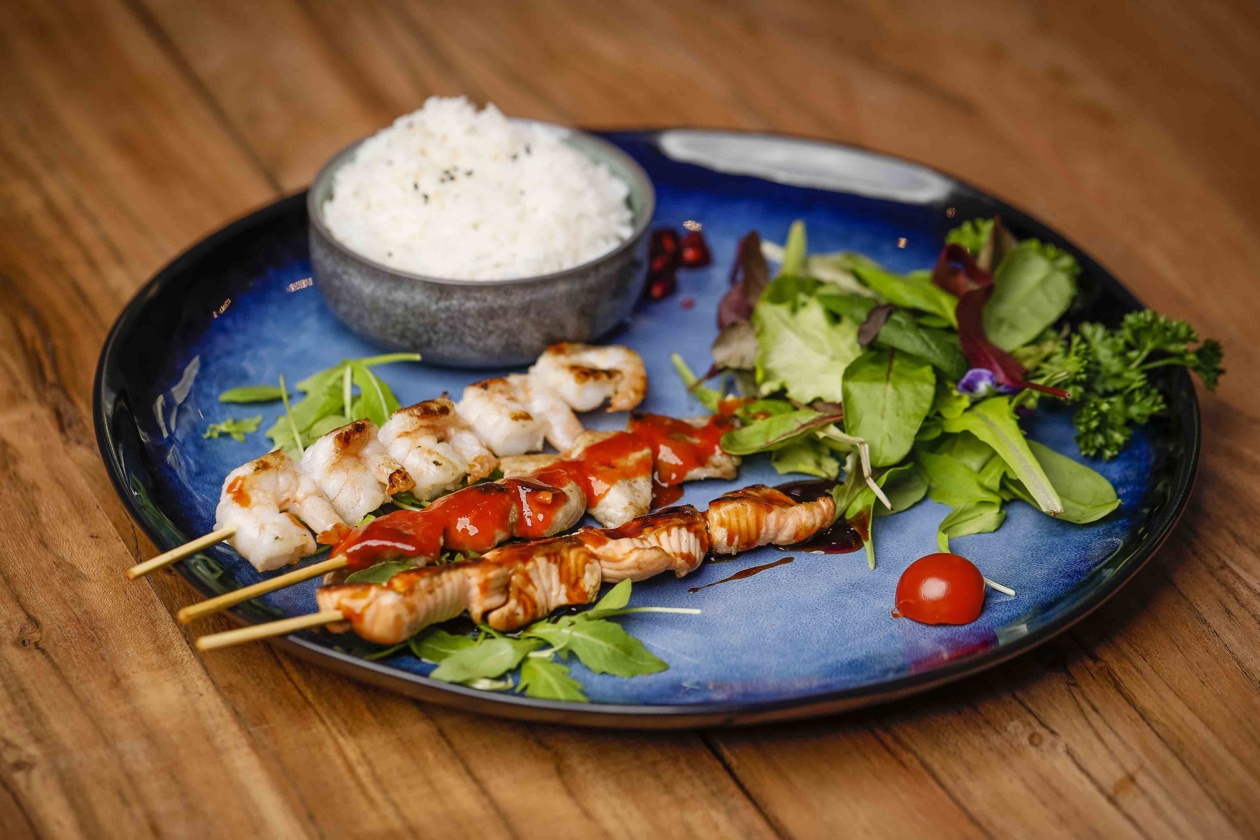 Die zweite Küchenlinie ist die amerikanische, die auch durch eine spannende Fusionsküche ergänzt wird: So finden sich auf der Karte zum Beispiel ein Sashimi-Burger mit Wasabi oder ein Burger mit gebackenen Garnelen, Asia-Sauce und Avocado. Echte Ami-Gerichte wie ein klassischer Burger (mit gebackenem Käse als Highlight) oder Spare Ribs dürfen natürlich auch nicht fehlen. Dessert-Liebling ist das Mochi-Eis in verschiedenen Sorten. Von Montag bis Freitag von 11 bis 15 Uhr gibt es einen Business-Lunch mit Tagessuppe, Sushi, Poke Bowls, Asia-Pasta und Wok-Gerichten.
