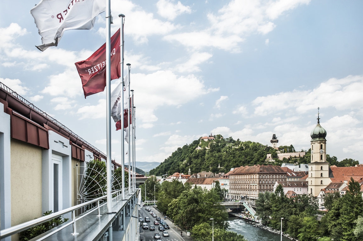 Großes Beitragsfoto: Ein schöner Blick vom Banksy-Zimmer des Grand Hotel Wiesler auf die Stadt Graz. (Foto Dominik Gruss)