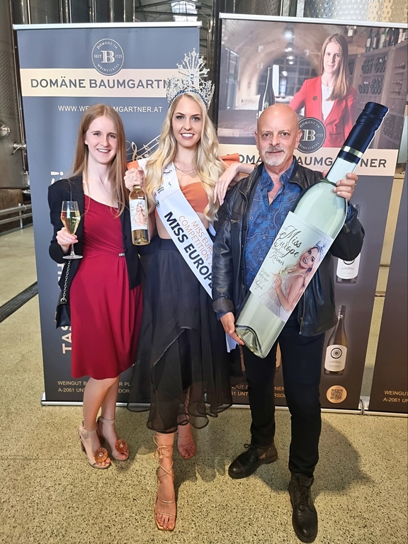 Grüner Veltliner Edition „MISS EUROPE BEATRICE KÖRMER 2021“ – Wein aus Niederösterreich dank Musik und liebevoller Kellerarbeit mit GOLD prämiert. Beatrice Körmer gewann bei der Miss Europe Wahl 2021 nicht nur den Titel, sondern auch eine eigene Weinedition mit Österreichs größtem Weingut, der Domäne Baumgartner. Die Präsentation und Verkostung fanden kürzlich bei einem prominent besetzten Dinner im Familienweingut in Untermarkersdorf statt.