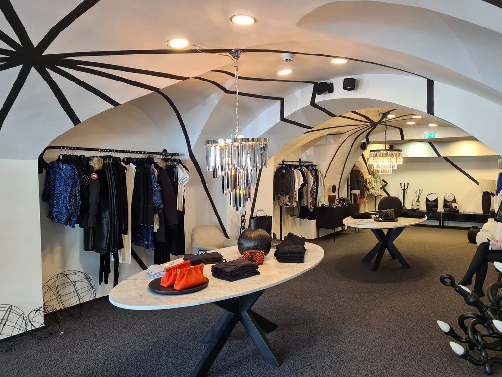 Die Lobby des Aiola Hotels reicht jetzt in die ehemaligen Brühl-Räumlichkeiten, der Frühstücksraum wurde vergrößert. „Es ist ein schönes, offenes, ineinander übergehendes Konzept von Frühstücksraum, Store und Bar. So kannst Du z.B. an der Bar stehen und Schönes vom Regal nebenan kaufen. Ins ehemalige Trachtenschlössl vis a vis vom Landhauskeller kam ein Wasserbecken und die Bar AMOURO im Erdgeschoß wurde das Herz des Stores“, freut sich die Aiola-Chefin. Hier werden auf Schaufenster-Puppen ausgewählte Marken und Kollektionen “selected” by Stephan Lanzer präsentiert. Die Kundenberatung findet im ersten Stock des Stores mit der herrlichen Galerie statt.