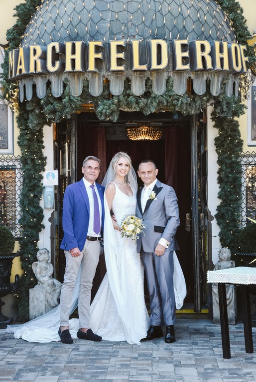 Ausgelassen gefeiert wurde im Brunnenhof des Marchfelderhofs, wo die Hochzeitsgesellschaft von einer 20köpfigen Musikkapelle musikalisch empfangen wurde. Anschließend verwöhnte das Team rund um Peter Grossmann mit Avocado-Tatare mit gebeiztem Lachs, Gurken-Klatschale, Eierschwammerl-Rostbraten und St. Petersfisch vom Grill und Pavlova mit Nougatmus und karibischen Früchten. Für die passende Weinbegleitung sorgte die Domäne Baumgartner aus Untermarkersdorf.