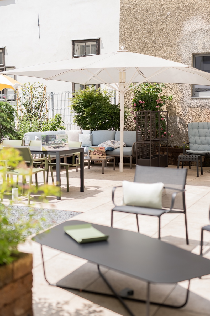 Sandra erzählt begeistert, dass sie mit unterschiedlichsten Menschen und verschiedensten Bedürfnissen zu tun hat. „Viele wissen schon genau, was sie wollen, da sie sich im Internet schlau gemacht haben. Da geht es dann oft nur mehr um Kleinigkeiten wie eine Farbbestimmung.“ Es freut sie aber sehr, wenn Kunden sich nach ihrer Beratung oftmals für mehr Farbe und vor allem auch für frische Farben entscheiden. Aktuell ist der Trend wieder pastellig. „Im Vorjahr waren die Farben bei Kettal noch etwas kräftiger, die neue Serie ist von den Farben gleich, aber eine Spur dezenter, eben pastelliger.“ Kettal stimmt die Farben der Bänder, der Ropes, der Kissen und die Aluminiumfarben sehr schön aufeinander ab. „Ich glaube, wir haben 30 verschiedene Bändervarianten und mindestens gleichviel Kissenvarianten – also man findet da sicher etwas“, lacht Sandra. Potocco beispielsweise bietet Bänder einfärbig in einem Grau- und einem Beigeton an, Farbe kommt dann mit den Kissen dazu. „Toll finde ich bei Potocco, dass sie bei manchen Möbelstücken dasselbe Modell für innen und draußen anbieten – nur in den entsprechenden Materialien natürlich.“ Sie spricht auch die Firma Fermob an, die für ihre Farbenfrohheit bekannt ist. „Die haben 24 verschiedene Farben, in denen sie produzieren können und die sie je nach Nachfrage anpassen.“