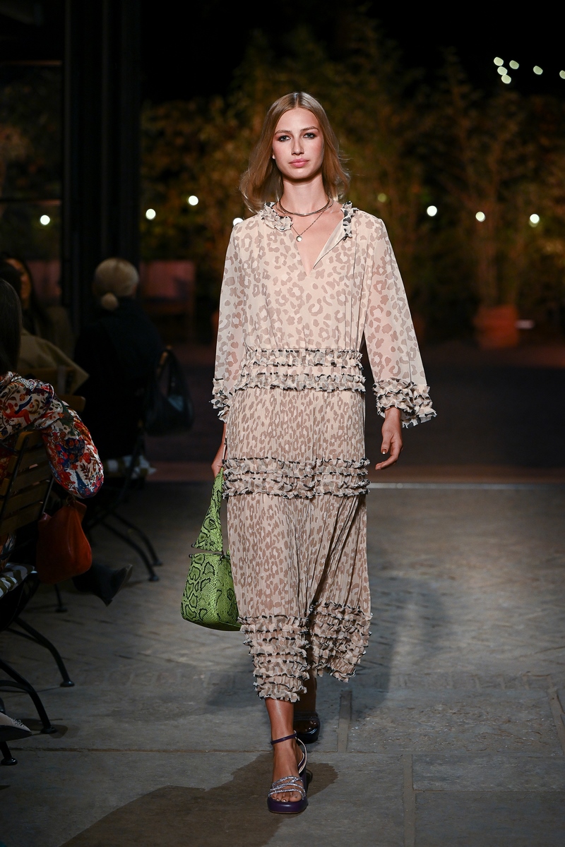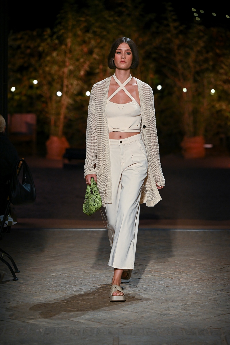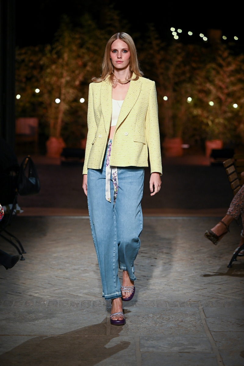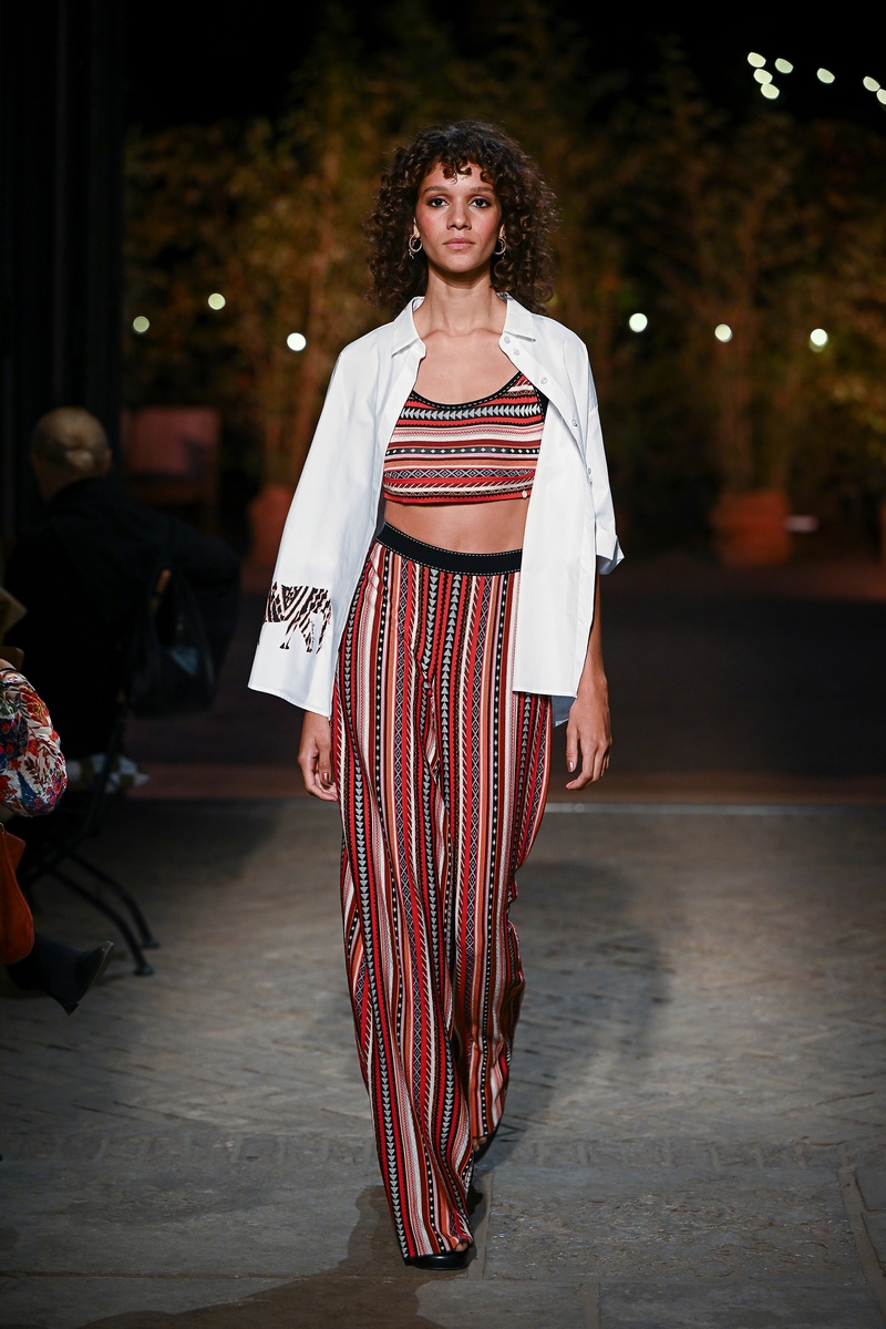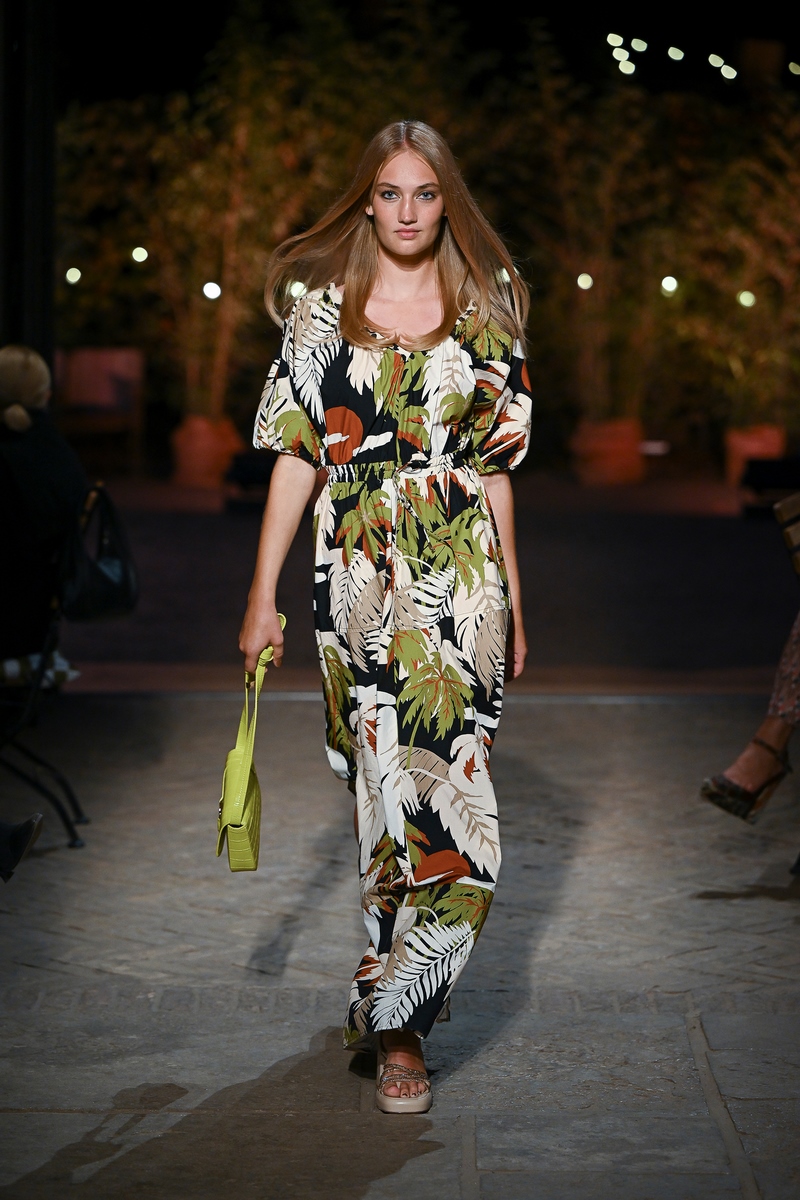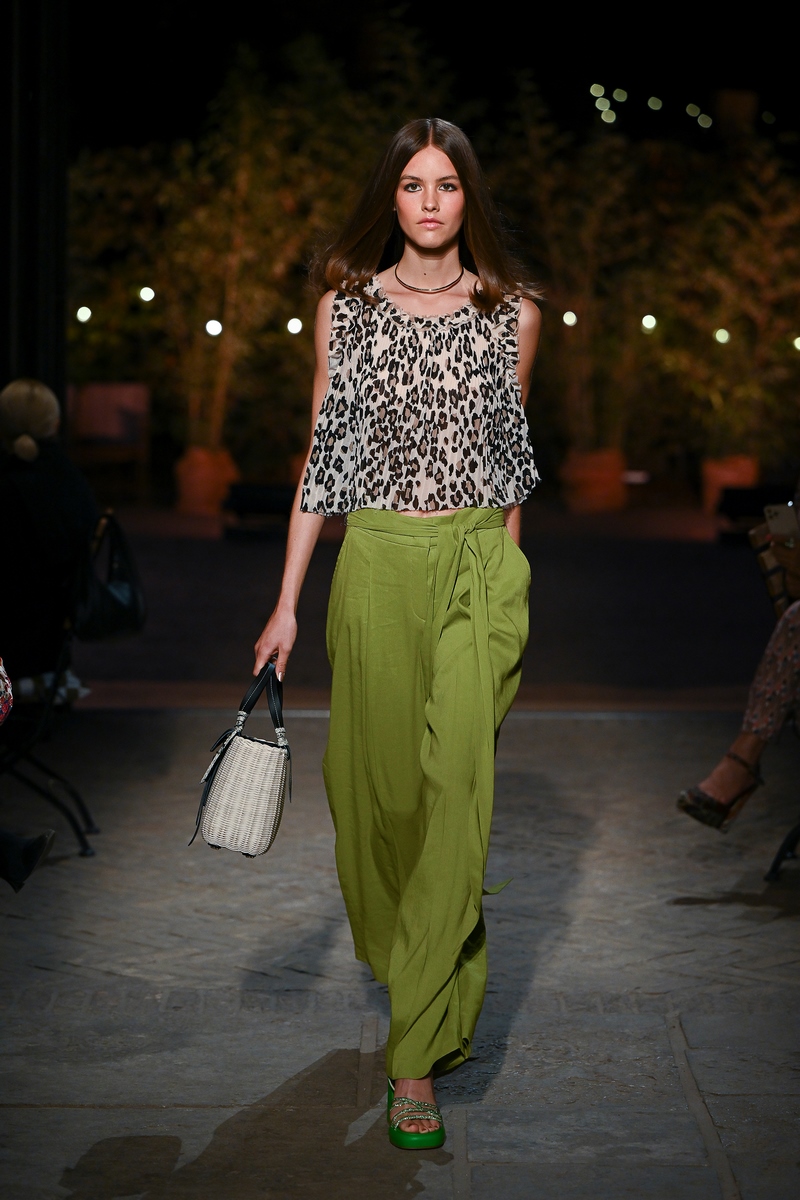 Luftige Stufenkleider, weit fließende Hosen und trendige Cropped Tops zogen sich als Stilelemente durch die Show. Farbige Croissantbags im Python-Style und Glitzersandalen rundeten die Outfits ab und standen immer im farblichen Kontrast zueinander.