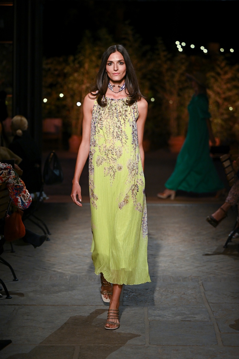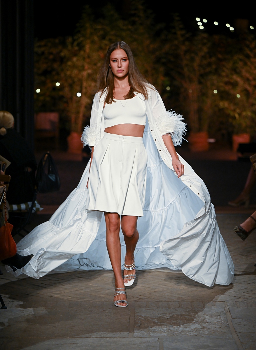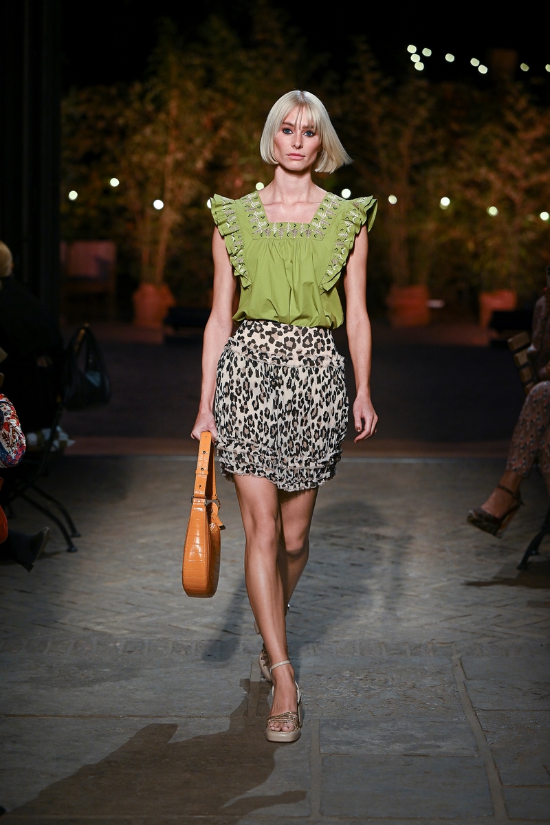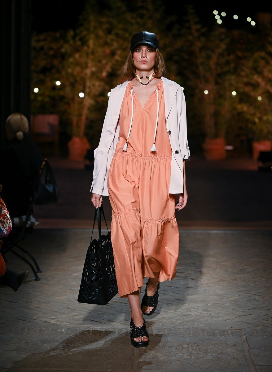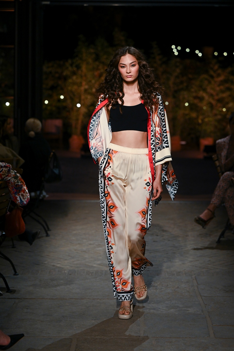 Luftige Stufenkleider, weit fließende Hosen und trendige Cropped Tops zogen sich als Stilelemente durch die Show. Farbige Croissantbags im Python-Style und Glitzersandalen rundeten die Outfits ab und standen immer im farblichen Kontrast zueinander.