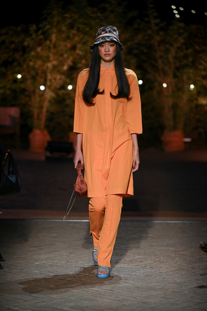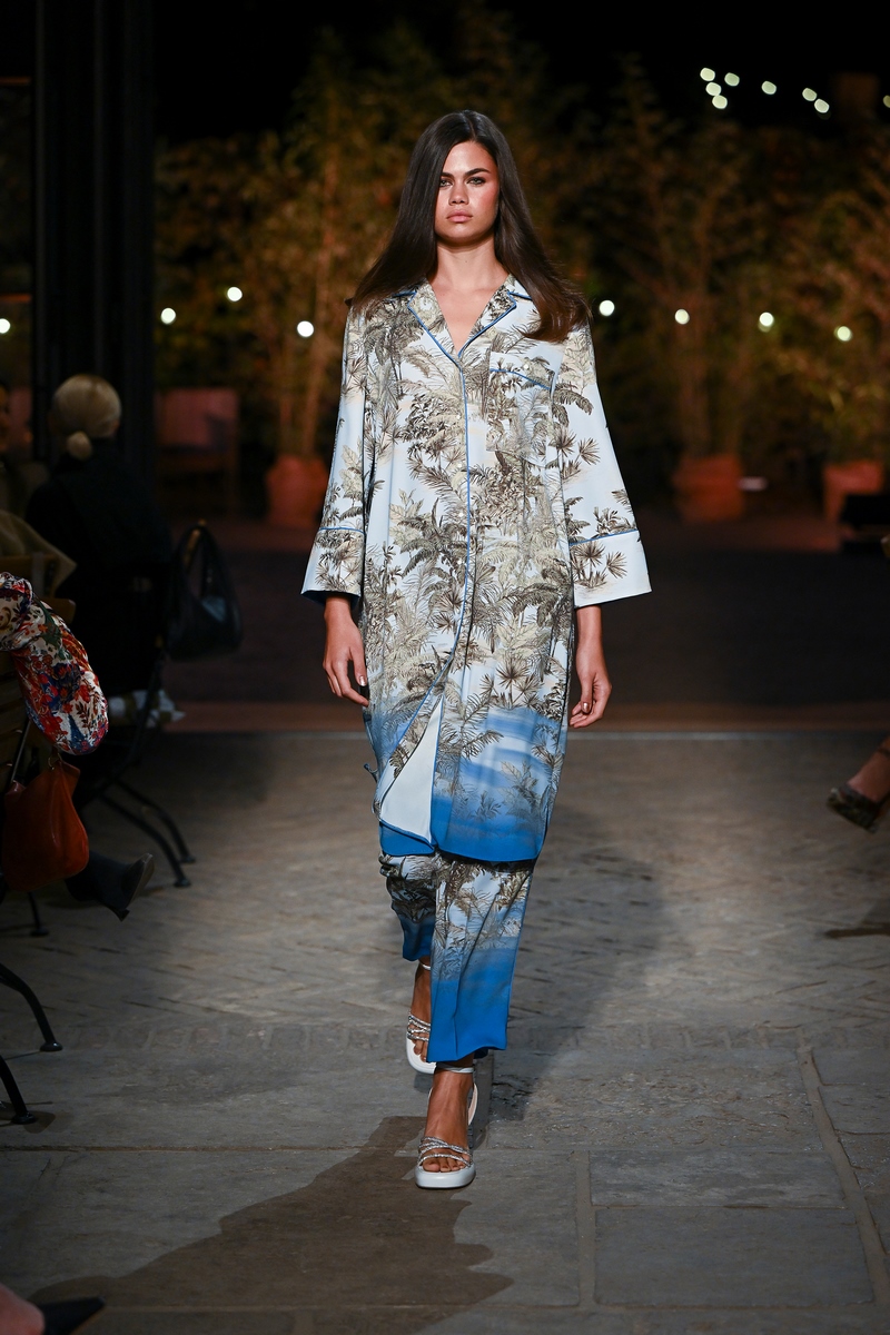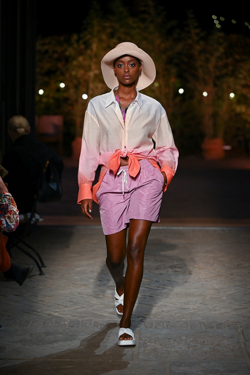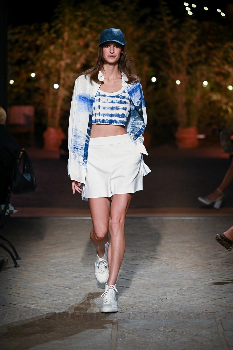 Palmen- und florale Drucke spiegelten den Naturgedanken wider. Die Looks spielten mit harmonischen Brüchen und Materialkontrasten. So wurden sportliche Shorts aus Taft und enge Radlerhosen mit eleganten Sommerkleidern oder femininem Strick gemixt.