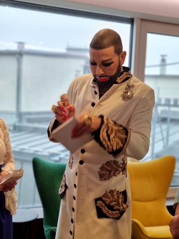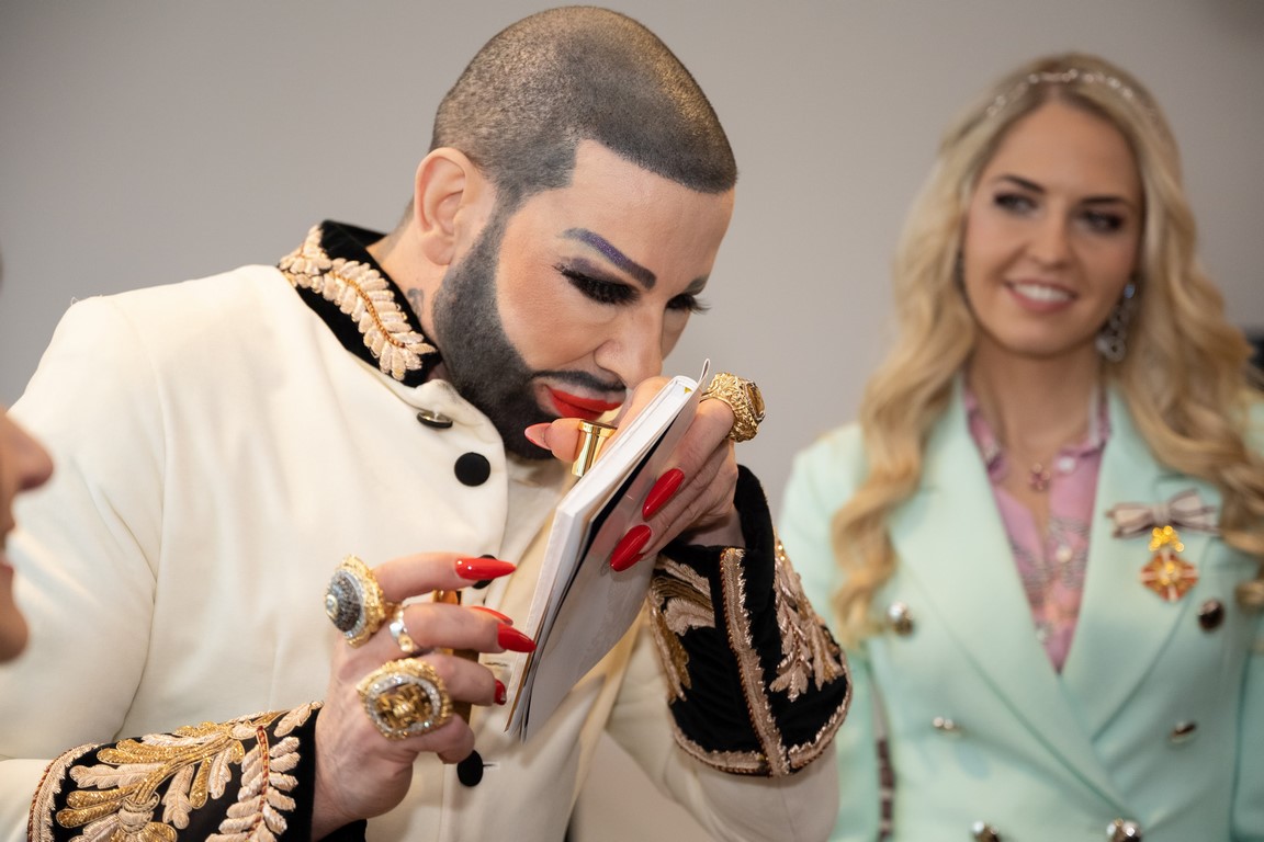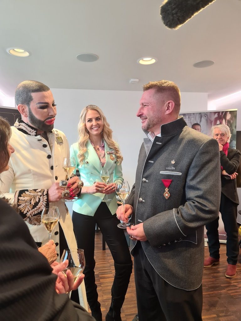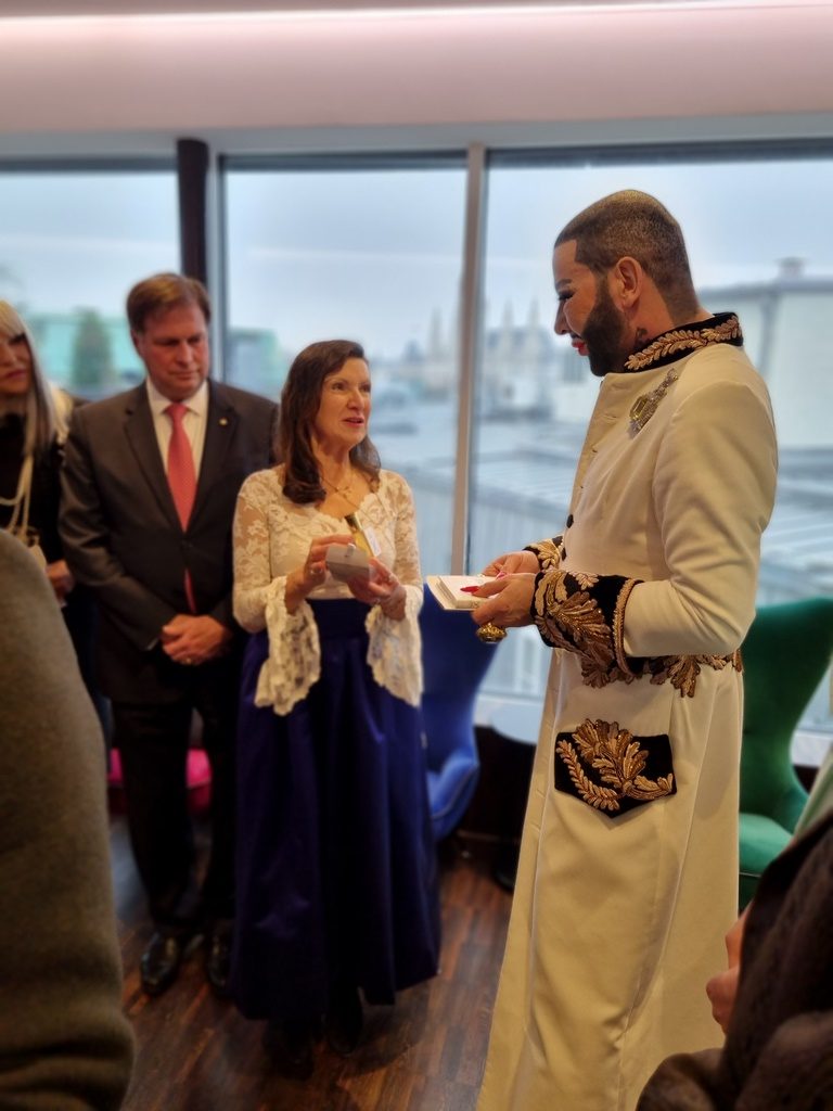 Nach einer Kutschenfahrt ins Schloss wurde Harald Glööckler im Rahmen eines beeindruckenden Friedenskonzertes mit den jahrelangen Unterstützern von „Flame of Peace“ – u.a. dem großartigen Tenor LASZLO und Countertenor Ivo Majer – der Kaiserlich Österreichische Franz Joseph-Orden verliehen. Dieser nahm ihn stilvoll royal im langem Designer-Mantel entgegen. Segnende und bewegende Worte fand Rektoratsassistent Michi Kobinia.