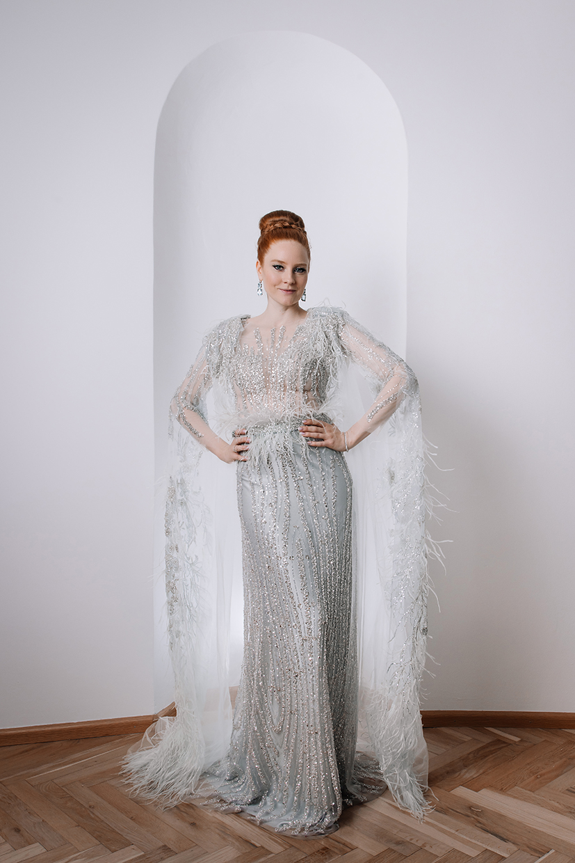 Seit Jahren glänzt das deutsche Model und Schauspielerin Barbara Meier in den traumhaften Kreationen der österreichischen Designerin und verzauberte auch den diesjährigen Opernball in einer feenhaften Ballrobe. Die vierteilige Couture-Robe in zarten Pastellmint- und Grautönen bestand aus einem femininen Body, einem fließenden Rock sowie einem Gürtel und wurde von einem zauberhaften Cape abgerundet, welches elegant über die Schultern von Barbara Meier fiel. Die einzigartige Kreation lebte durch die detailgetreue Bestickung mit Perlen und Pailletten, die einen sanften Kontrast in Silbertönen erzeugen und von den Federapplikationen veredelt werden.