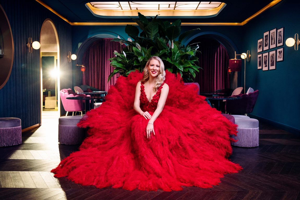 Unter dem Motto „Lady in Red“ designte Eva Poleschinski eine faszinierende Robe, die in einem starken Rot in schillernden Nuancen alle Blicke auf sich zog. Die Designerin kreierte eine detailreiche und dennoch sehr verspielte Couture Robe aus drei Teilen: der Body besteht aus zahlreichen, handgefertigten 3D Blüten, welche durch Perlenstickereien veredelt wurden. Das Herzstück ist der Eva Poleschinski „Signature Rock“, welcher aus einem Meer aus roten Straußen-Federn besteht. Durch einen handbestickten Gürtel wurde alles zu einer märchenhaften Ballrobe vereint.
