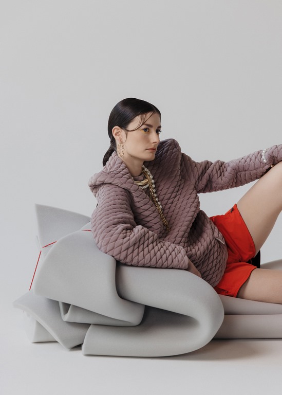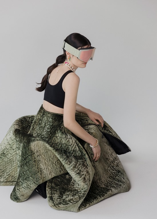 Wunderbare „Leftovers“ aus Skibekleidung, Bänder-Überbleibsel und einzigartige Interieur Stoffe aus Tirol sind hier die Protagonisten und bringen ihre Kreativität in ausgefallenen Designs zum Ausdruck. Die Magie liegt in den ungleichen Verbindungen: Schützende und funktionale Silhouetten verschmelzen mit üppigen Texturen, verdrehten Lagen, sowie dekorativen und extravaganten Designs. Satte Schattierungen und vielfältige Texturen erzeugen eine illusorische Spannung.