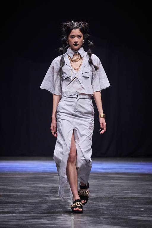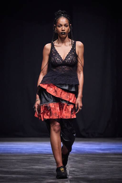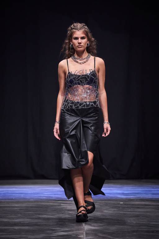 Der Zauber liegt in den ungleichen Verbindungen: Schützende und funktionale Silhouetten verschmelzen mit filigranen Texturen, verdrehten Lagen, sowie dekorativen Accessoires aus Gold und Edelsteinen. Satte Schattierungen und vielfältige Texturen erzeugen eine illusorische Spannung. Wunderbar recycelte „Leftovers“ aus Skibekleidung & Schmuck in Kombination mit nachhaltigen Dessous und handverlesenen Spitzen bringen ihre Kreativität in ausgefallenen Designs zum Ausdruck.