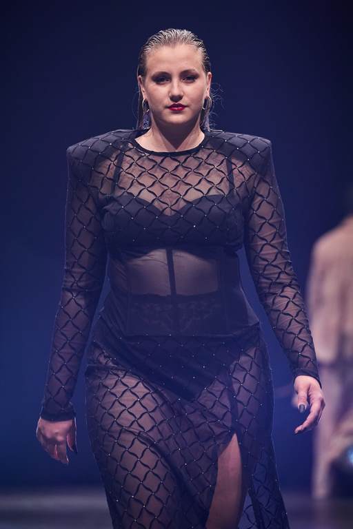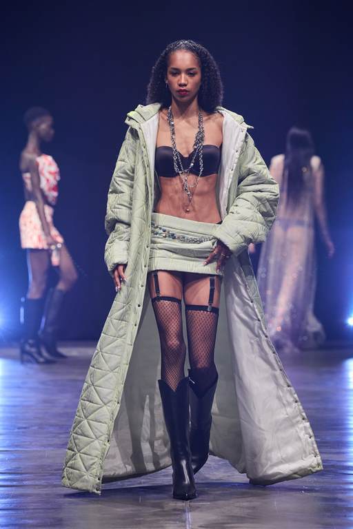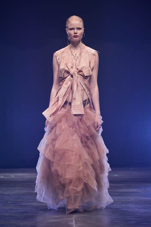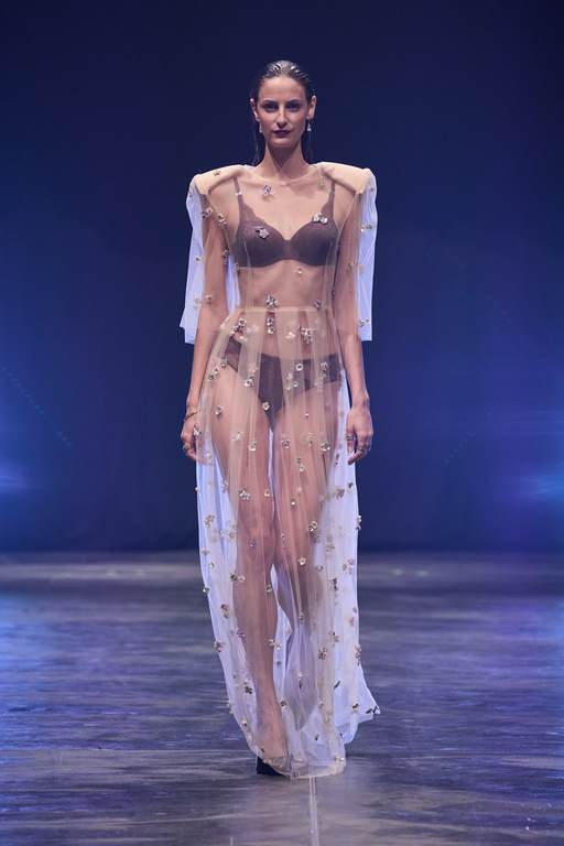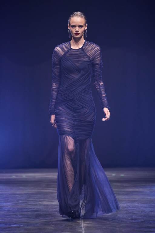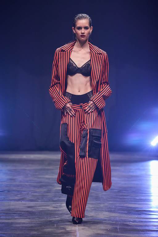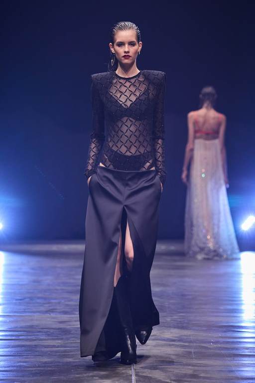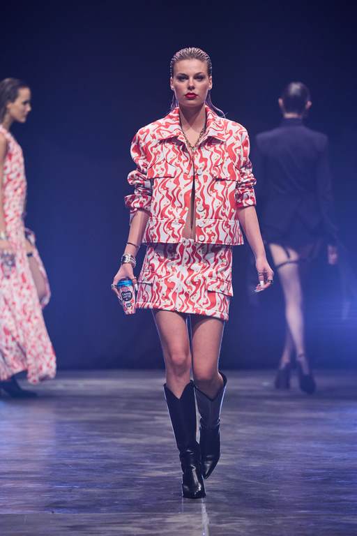 So außergewöhnlich wie der Laufsteg waren auch die 60 atemberaubenden Looks, die den Beverly Hills Vibe nach Berlin transportierten. 49 Damen- und 11 Männer-Looks faszinierten mit progressiven Streetstyles und verführerischer Evening-Wear. Wie immer überraschte der Berliner Designer mit einem außergewöhnlichen Materialmix: Luxuriöse Stoffe mit starken Farb-Kombinationen und Popcorn-Prints machen aus klassischen Schnitten gepaart mit Brüchen und feinen Details raffinierte Day- und Night-Looks. In dieser Saison arbeitet Kilian Kerner mit transparenten Stoffen mit Strass und aufgesetzten Blumen, Pailletten auf Denim, Tüll und Lederimitaten. Die typischen Kilian Kerner Elemente wie geraffte Hosenbünde, halbe und gedrehte Kragenlösungen und lange Abendkleider treffen auf extrem kurze Miniröcke und -kleider. Noch nie war eine Kollektion so verführerisch und verrucht.