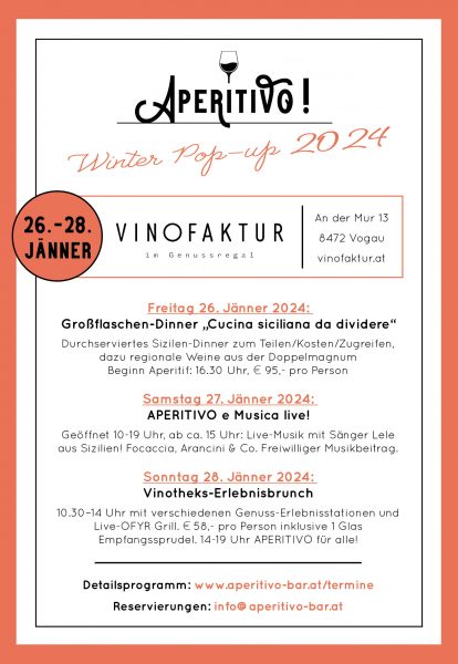 APERITIVO – die beliebte italienisch-steirische Pop-up-Bar an der südsteirischen Weinstraße ist mit dem 1. Winter-Pop-up zu Gast in der Vinofaktur in Vogau. Von Freitag 26. bis Sonntag 28. Jänner 2024 lautet das (kulinarische) Motto „Viva la Sicilia.