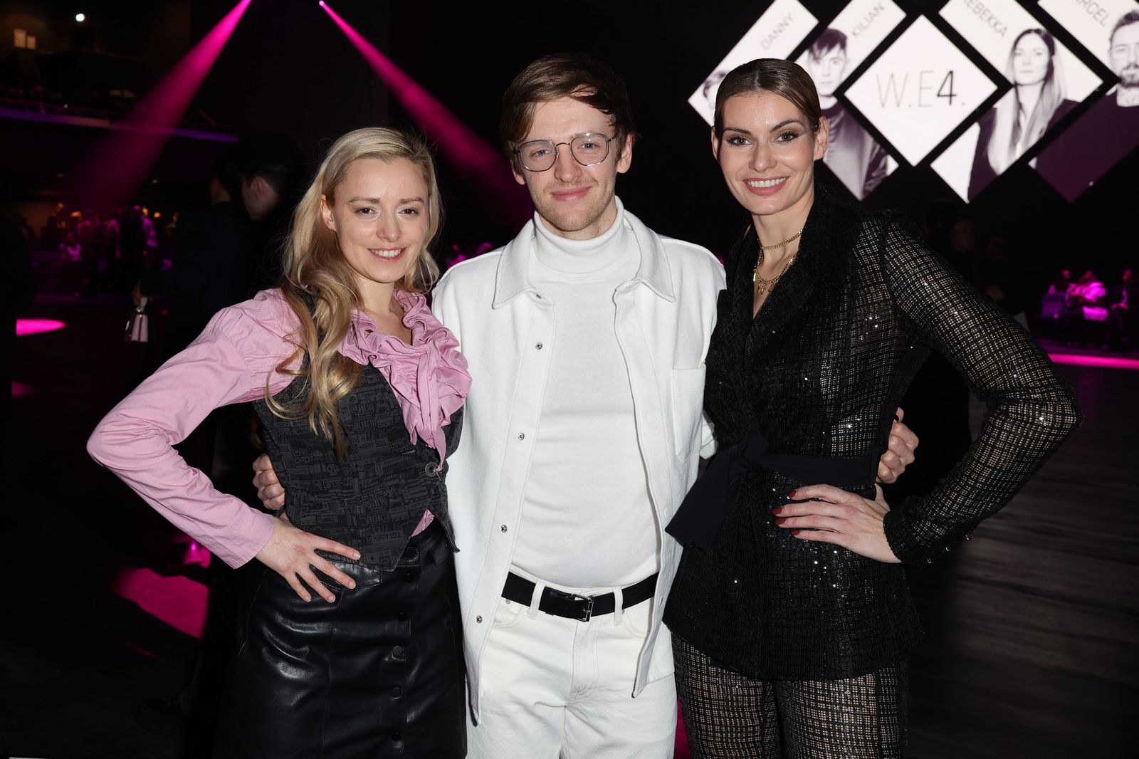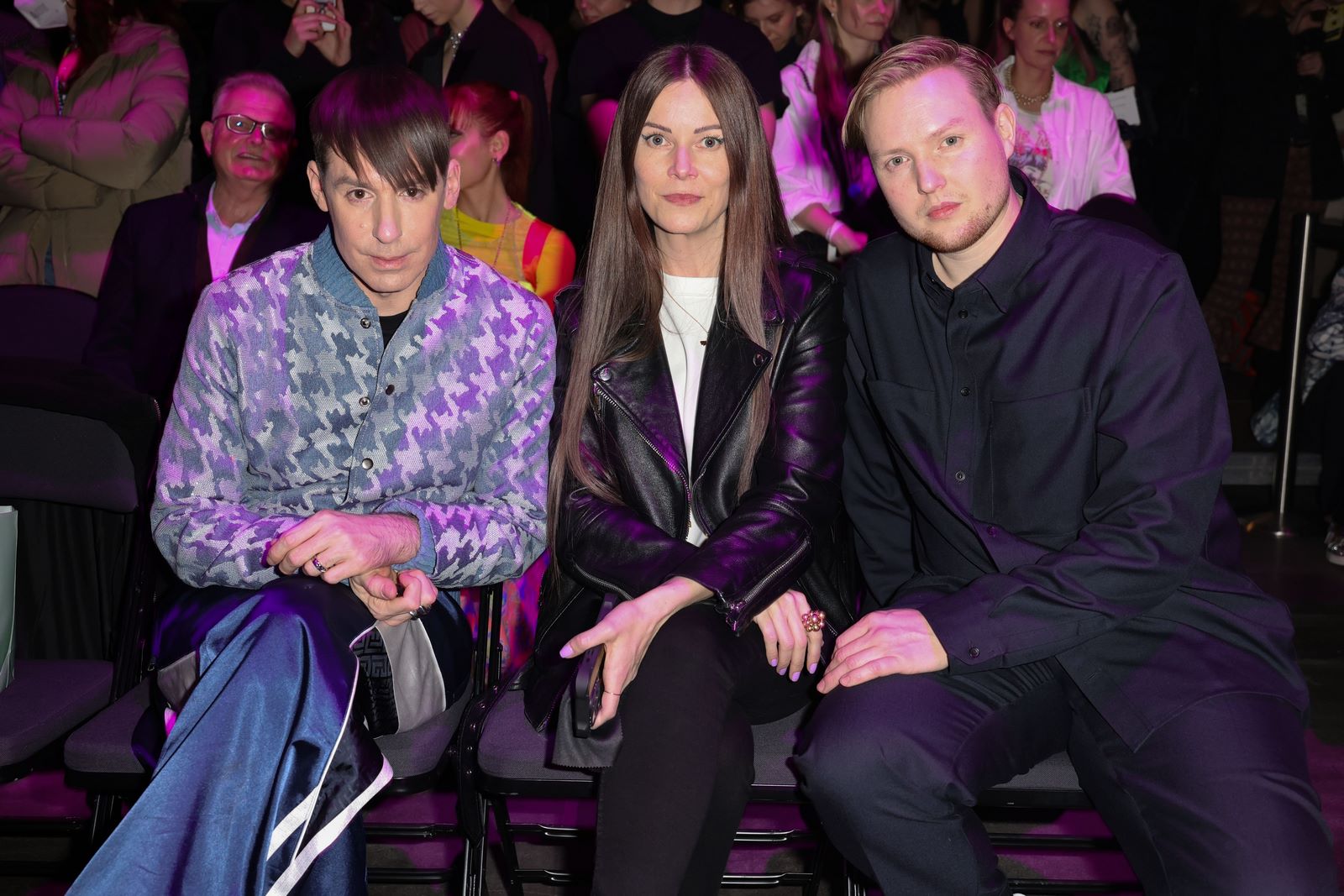 BERLIN, GERMANY – FEBRUARY 07: (L-R) Kilian Kerner, Rebekka Ruetz and Danny Reinke attend the Marcel Ostertag Fashion show as part of Berlin Fashion Week AW24 on February 07, 2024 in Berlin, Germany. (Photo by Andreas Rentz/Getty Images)