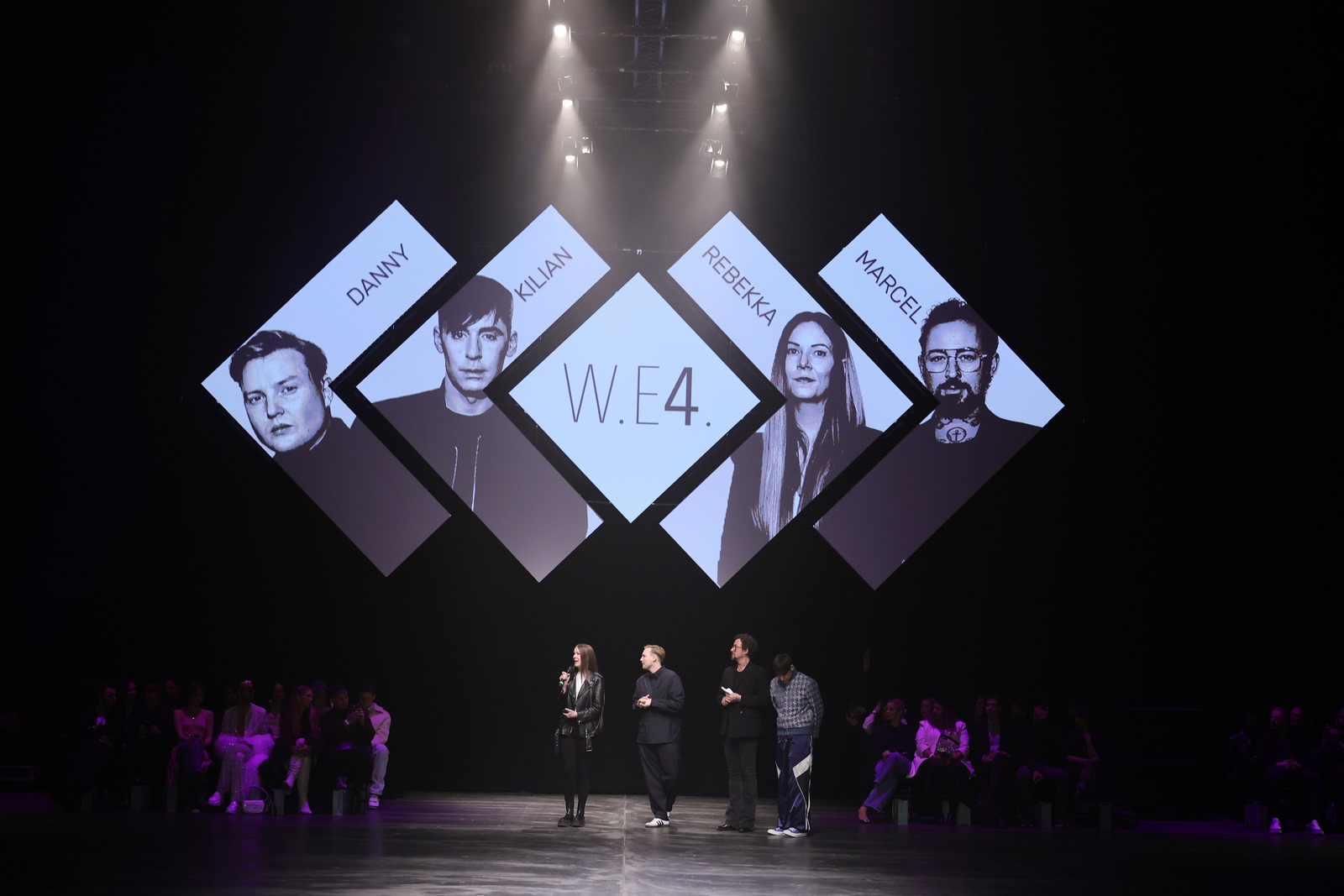 BERLIN, GERMANY – FEBRUARY 07: Rebekka Ruetz, Danny Reike, Marcel Ostertag and Kilian Kerner are seen on the runway during the Marcel Ostertag Runway Show as part of the W.E4. Fashion Day during Berlin Fashion Week AW24 at Verti Music Hall on February 07, 2024 in Berlin, Germany. (Photo by Andreas Rentz/Getty Images for Marcel Ostertag)