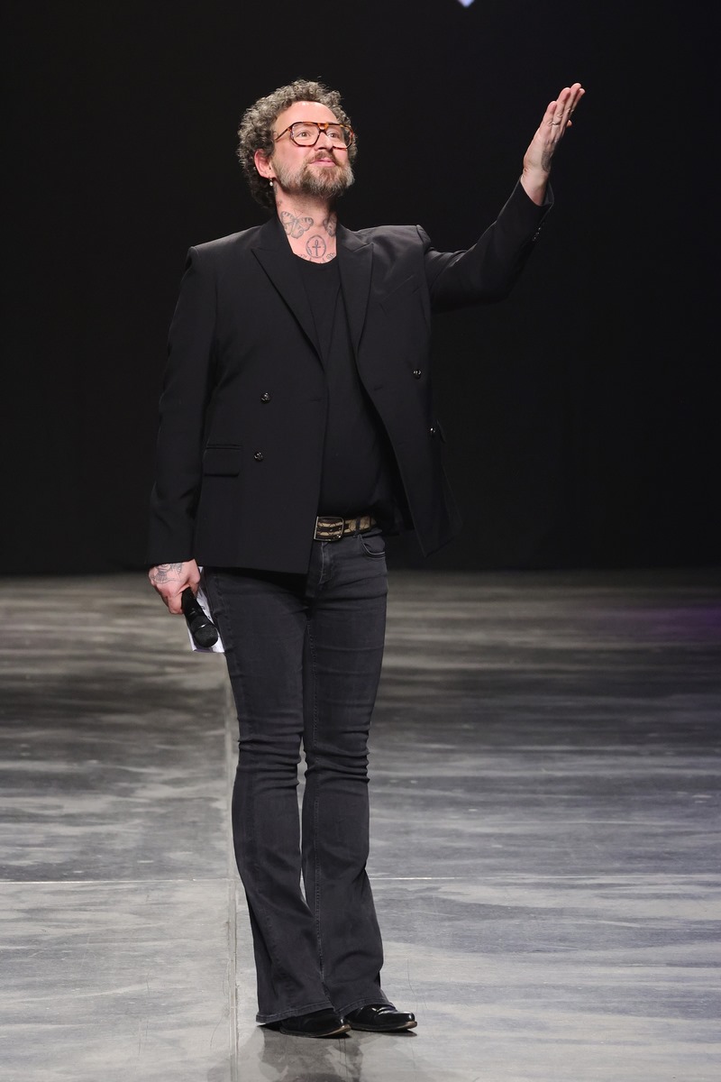 BERLIN, GERMANY – FEBRUARY 07: Marcel Ostertag reacts to the applause of the audience on the runway during the Marcel Ostertag Runway Show as part of the W.E4. Fashion Day during Berlin Fashion Week AW24 at Verti Music Hall on February 07, 2024 in Berlin, Germany. (Photo by Andreas Rentz/Getty Images for Marcel Ostertag)